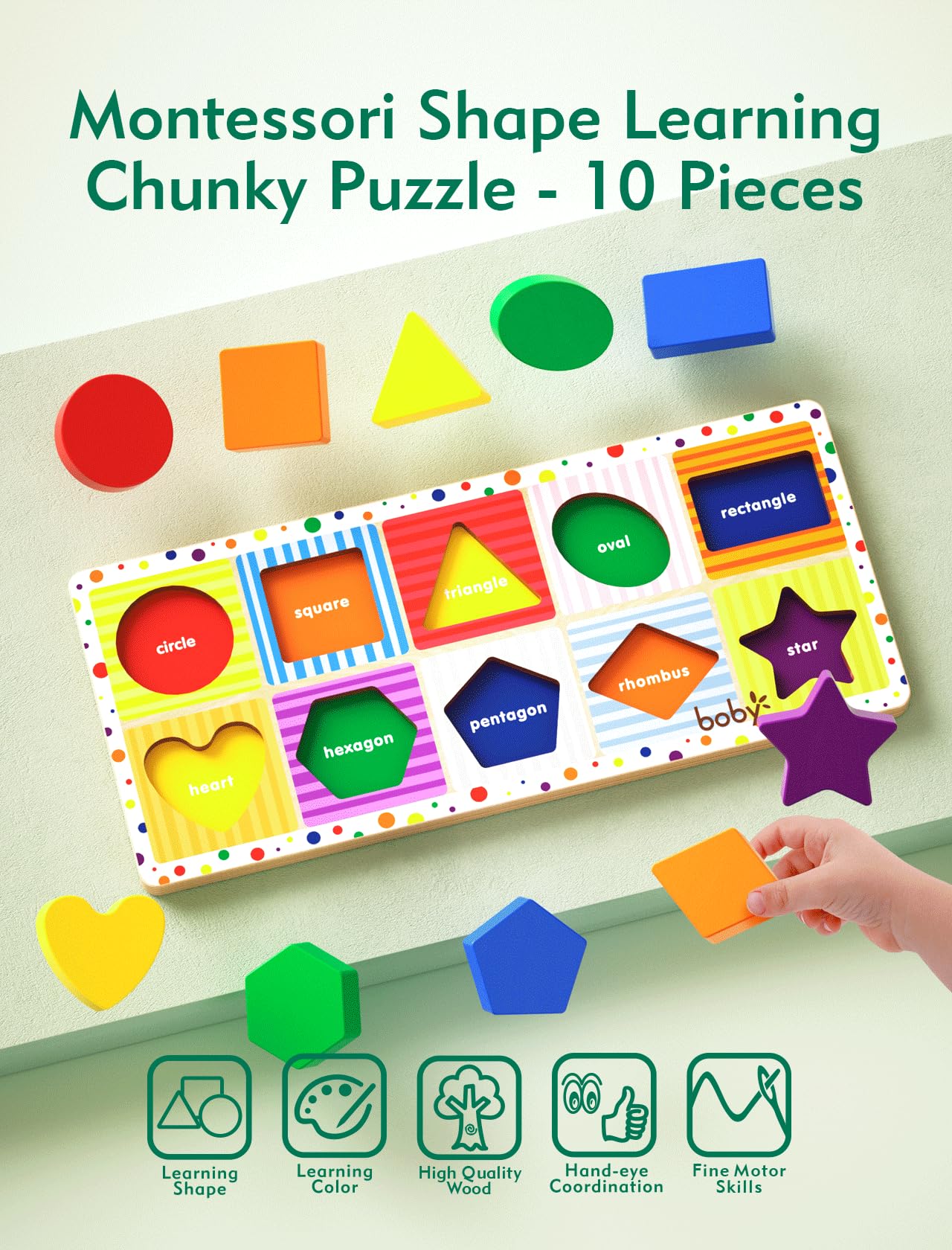 Boby Shapes Wooden Chunky Puzzle (10 Pcs) - Wooden Puzzles For Toddlers, Animal Puzzles For Kids Ages 2+