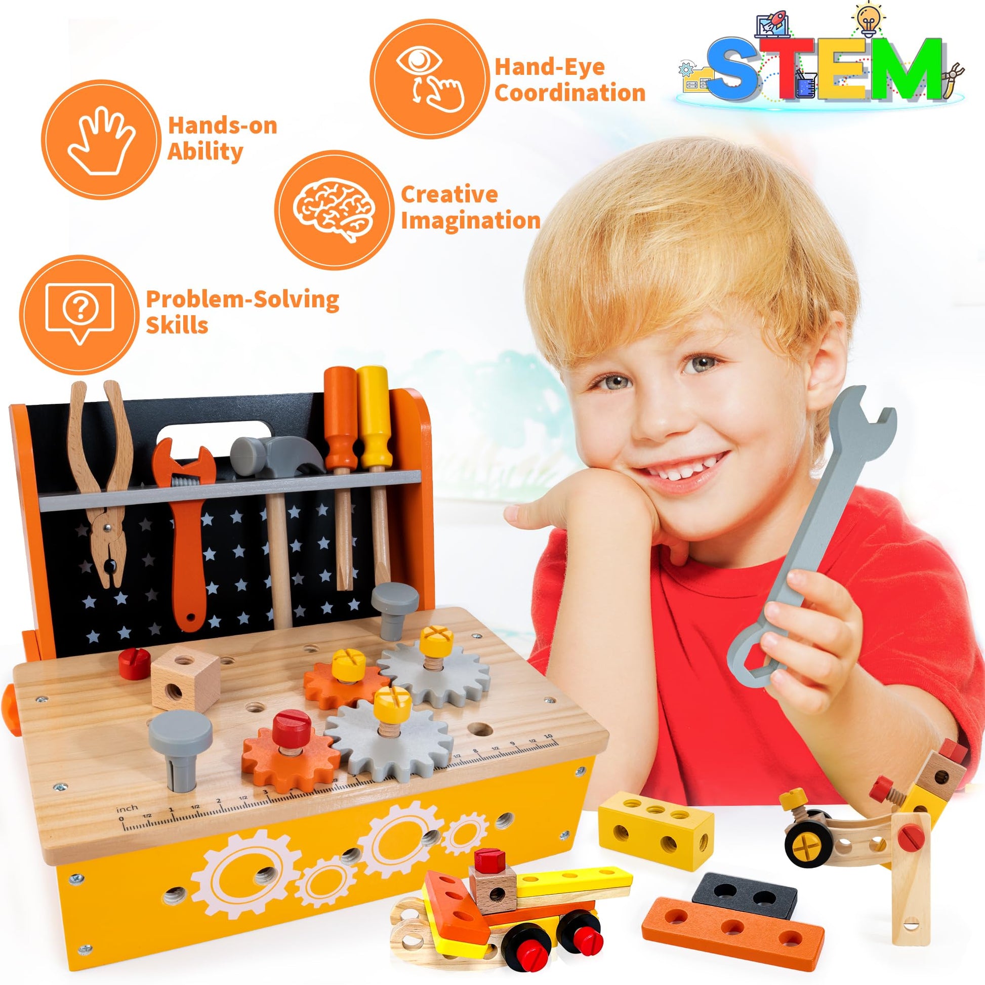 KIDWILL Wooden Tool Bench for Kids, 54-Piece Kids Tool Set with 2-in-1 Workbench & Take-Along Tool Kit, STEM Educational Toy Too