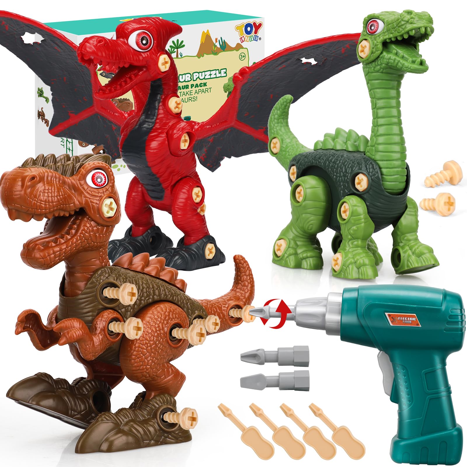 TOY Life 3-Pack Take Apart Dinosaur Toys for Kids 3 5 7 Kids Dinosaur Toys with Electric Drill Dinosaur Birthday Gifts Take Apar