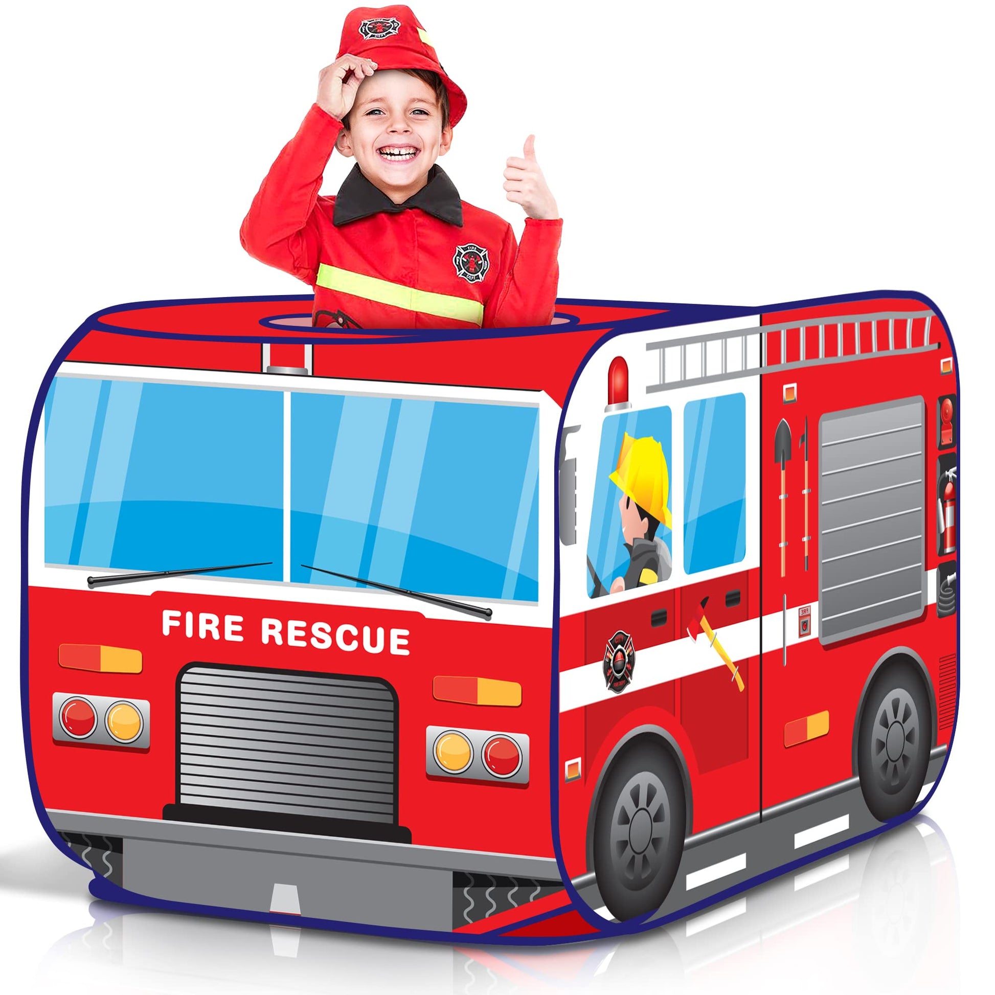 - Q: Does the fire truck tent have openings for play? A: Yes, the tent features multiple openings, including 2 on the top and 1 in the back, allowing for fun crawling and peek-a-boo play.