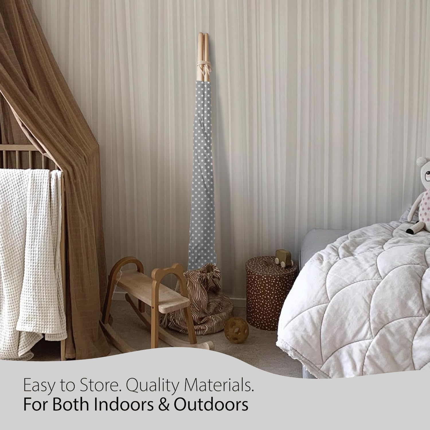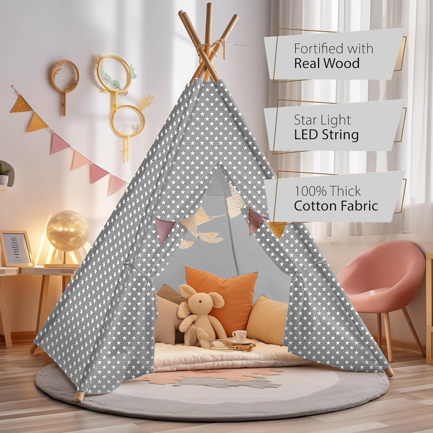 Chic Grey and Stars Kids Teepee Tent with Magic Star Lights, Large and Durable 100% Cotton Tipi Play Tent for Boys and Girls, Ideal for Imaginative Cozy Indoor Playhouse Easy Setup and Foldable Design