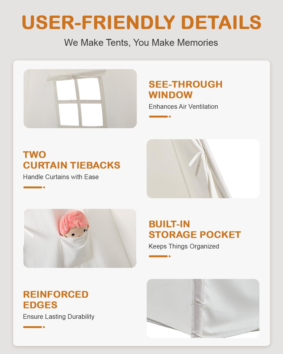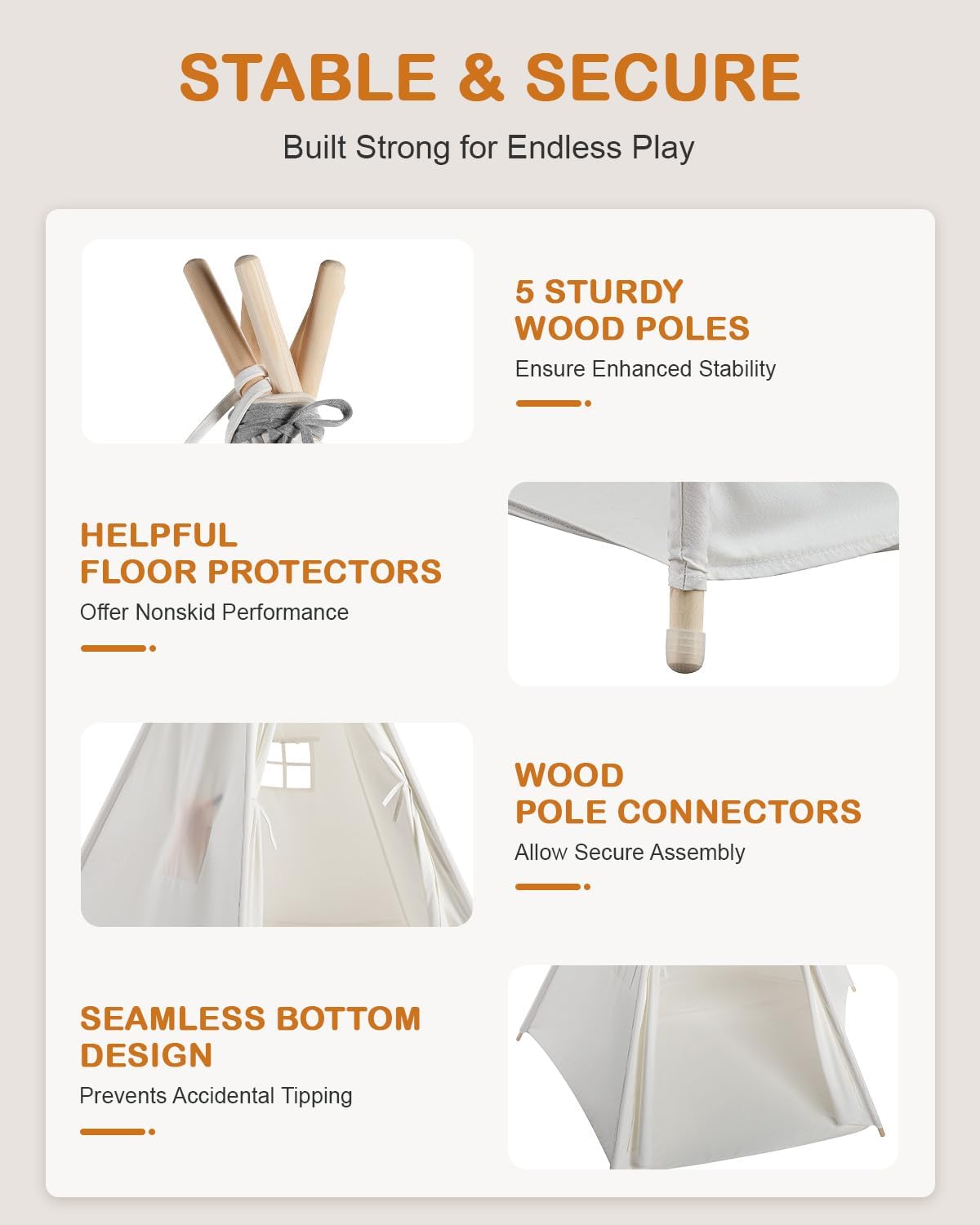 - Q: How many children can fit in the teepee? A: The spacious design of the teepee, measuring 48" x 48" x 72", comfortably accommodates up to 3 kids, making it perfect for playdates and social interactions.