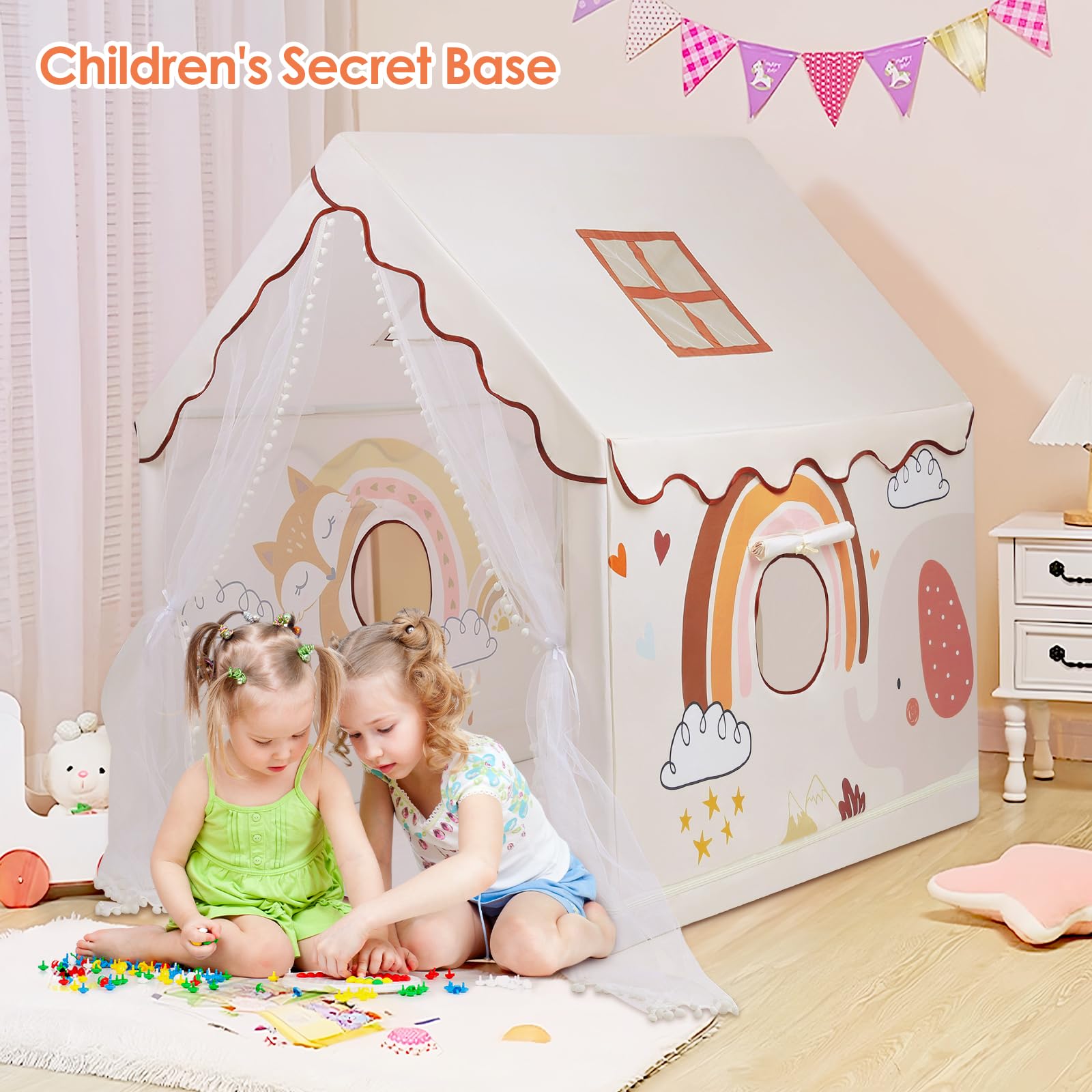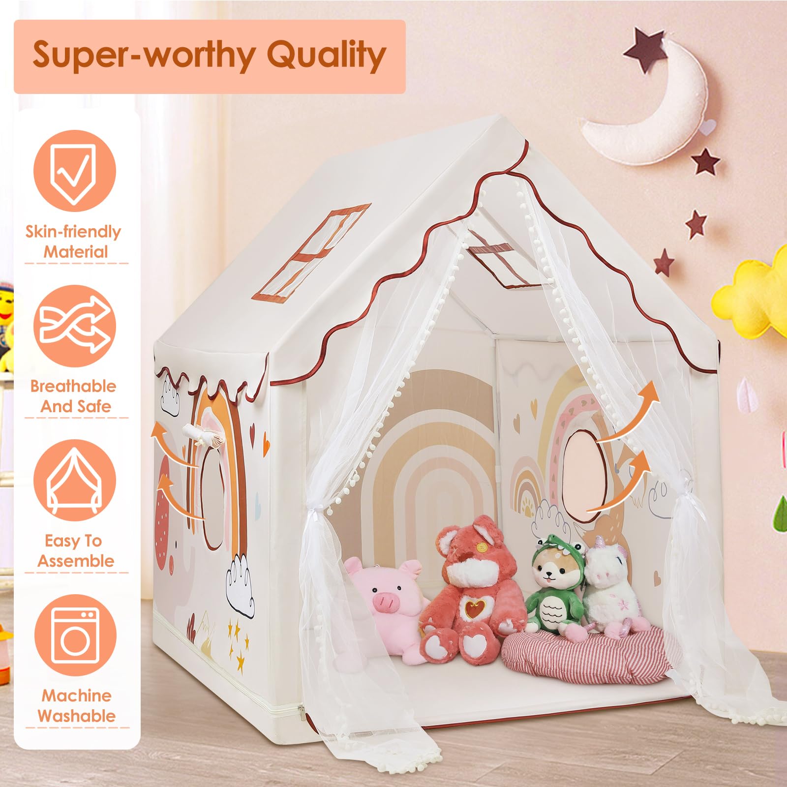 ?Spacious and Cozy?Our children's tent measures 47 inches long x 39 inches wide x 51 inches high and can accommodate 2-3 children to move freely in it. It is a great place for kids to rest and read and play. | ?Fun Pattern?Our tent for kids have unique pattern design, It's very attractive to children.With the net curtains hanging down, kids imagination will be stimulated by the interesting patterns as they enjoys their private space | ?Sturdy and Durable?Our kids tent is made of high quality polyester fiber and sturdy metal poles, very solid and not easy to break..It has a large door on the side and 4 large windows on the front and roof for good ventilation. | ?User-friendly?Our playhouse equip with instructions for simple assembly and ready to use. Comes with a cloth pocket to stow the folded tent away, so you can easily take the tent to reading room bedroom backyard party for use. | ?Best gift?The best gift that children receive at Halloween Christmas and birthdays, the rich way to use it will reward children with more joy and smiles. It is also suitable for decorating kids' bedroom playroom.