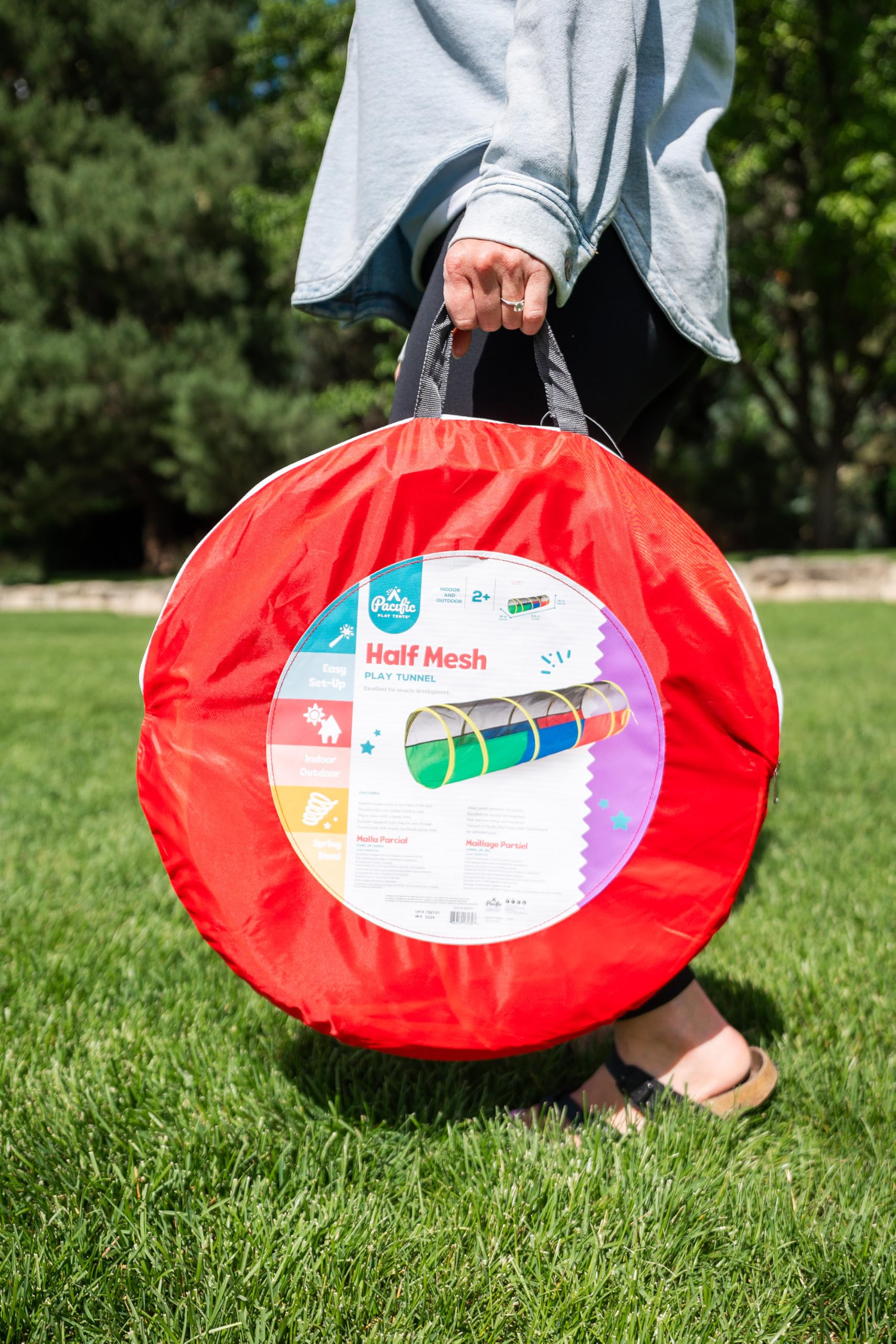 This is the ideal outdoor play tunnel! Our Pacific Play Tents Half-Mesh Play Tunnel will be your new spring and summer staple. Kids will have hours of fun thanks to the large mesh panels to help with air circulation, and the travel and storage bag makes it easy to pack after a long day of play. The durable fabric makes it perfect for outdoor play and is super easy to wipe clean with just a damp cloth. Connect it to any of our tents with a tunnel port for even more imaginative fun! Ideal for both indoor and outdoor play.