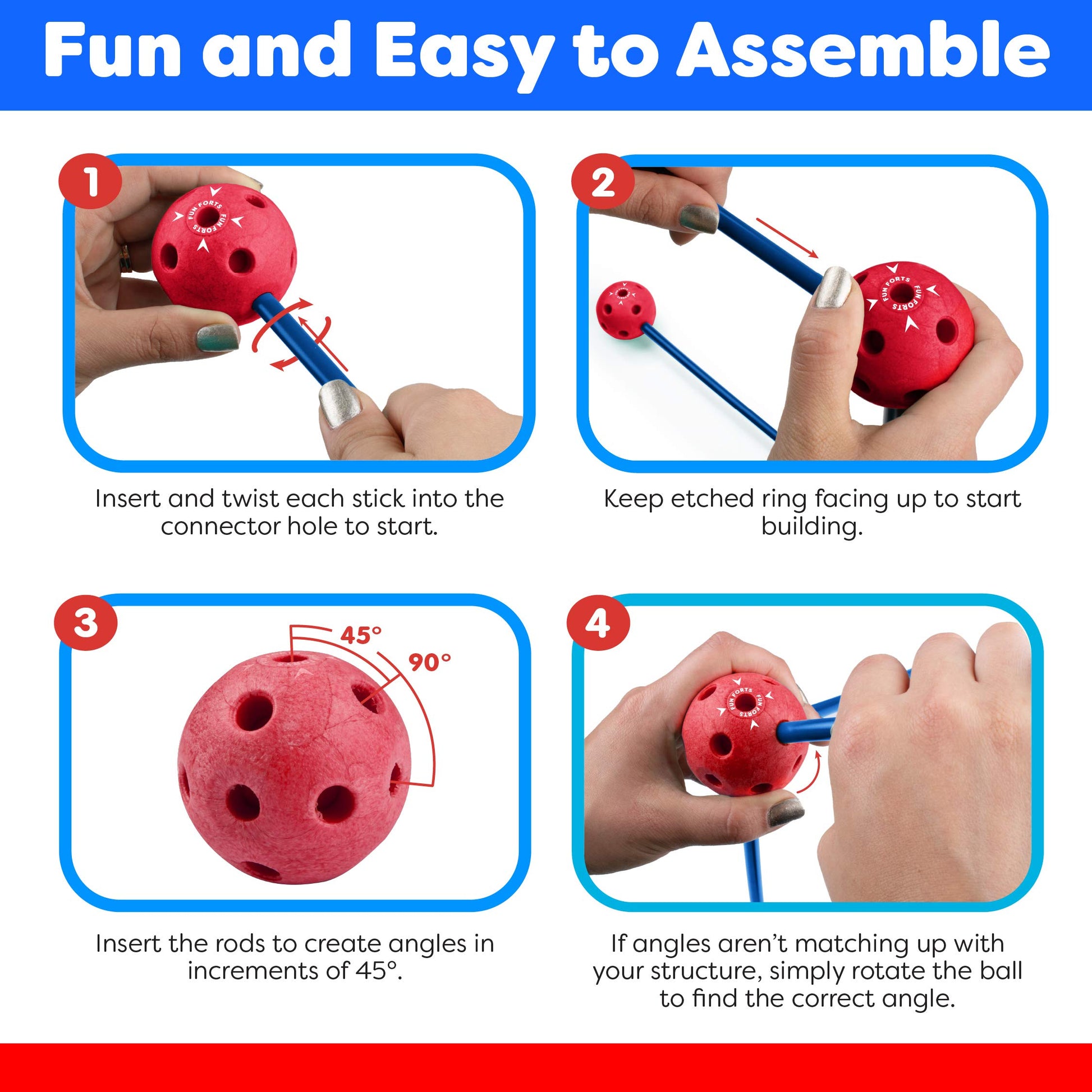 - Q: Is adult supervision required during play? A: While kids can build their own forts, adult supervision is advised to ensure safety, especially when inserting and twisting the rods into the spheres.