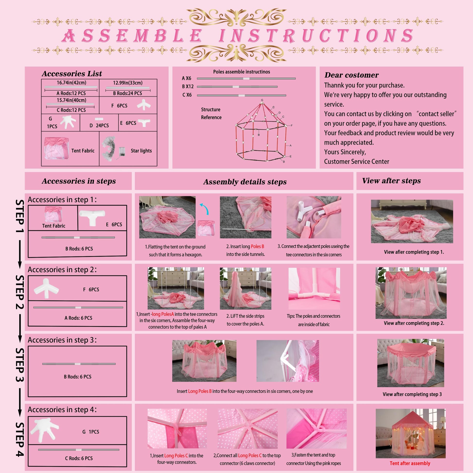 Product Name: Princess Castle Play Tent Material: Polyester Taffeta Dimension: 55 x 53 inches (Diameter x Height) Ages: 3 years and up Tips: The color maybe have a slightly different because of the light and color temperature. Please don't worry, this is not a quality issue. Portable Tent Bag Our play tent is easily foldable, you could fold it into small size and store it into the bag to save space when your kids temporarily do not use it. The portable design also makes it handy for you to take along with. Extra-long Star Light String With an updated design, the string of star lights in our tent set is extra-long with a total of 7.5 meters. The 50 LED lights on it will romantically twinkle and make it become the perfect scenery in your house at night. Packing List - Tent with carry bag and instruction - 1 Set of PVC Poles:l - 1 Set of Conectors: - A String of Star Light - NOTE: 3 * AA batteries and the dolls show in pictures are not included. Our beautiful princess playhouse will realize your little girls dream of being a princes