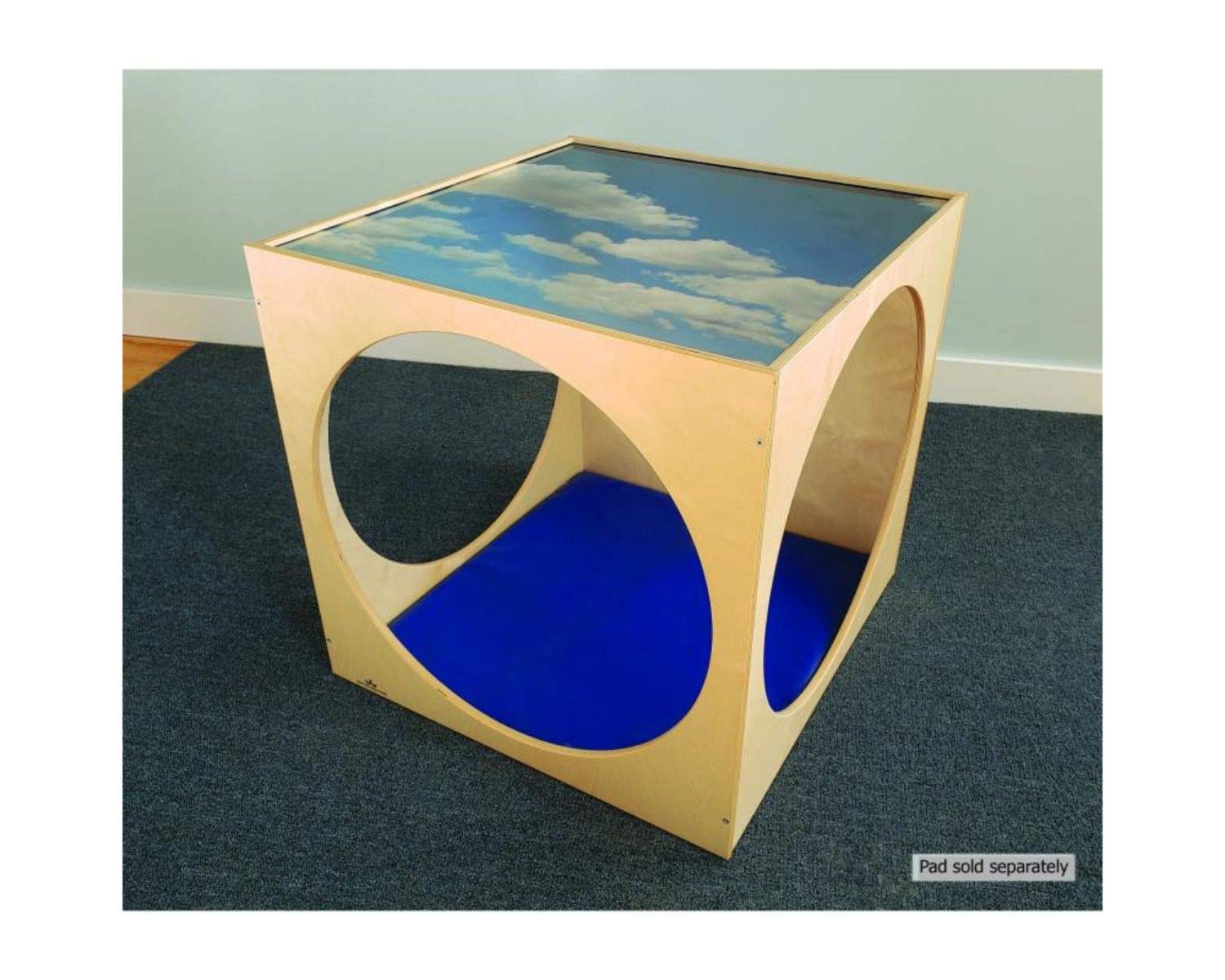 Another Whitney Brothers innovation! The top panel of our best-selling Play House Cube is a safe, sturdy, shatterproof acrylic panel imprinted with a serene sky and clouds scene that invites children inside for a peaceful break and provides easy visibility for supervision. Brightens any room environment and satisfies every state requirement for a quiet space in Early Learning environments. Large enough for a preschooler or two, or a peaceful place for children to curl up with a pillow and blanket. All edges are rounded over and sanded smooth for safety. Need a floor mat? Purchase the WB0211 Blue Floor Mat, sold separately.