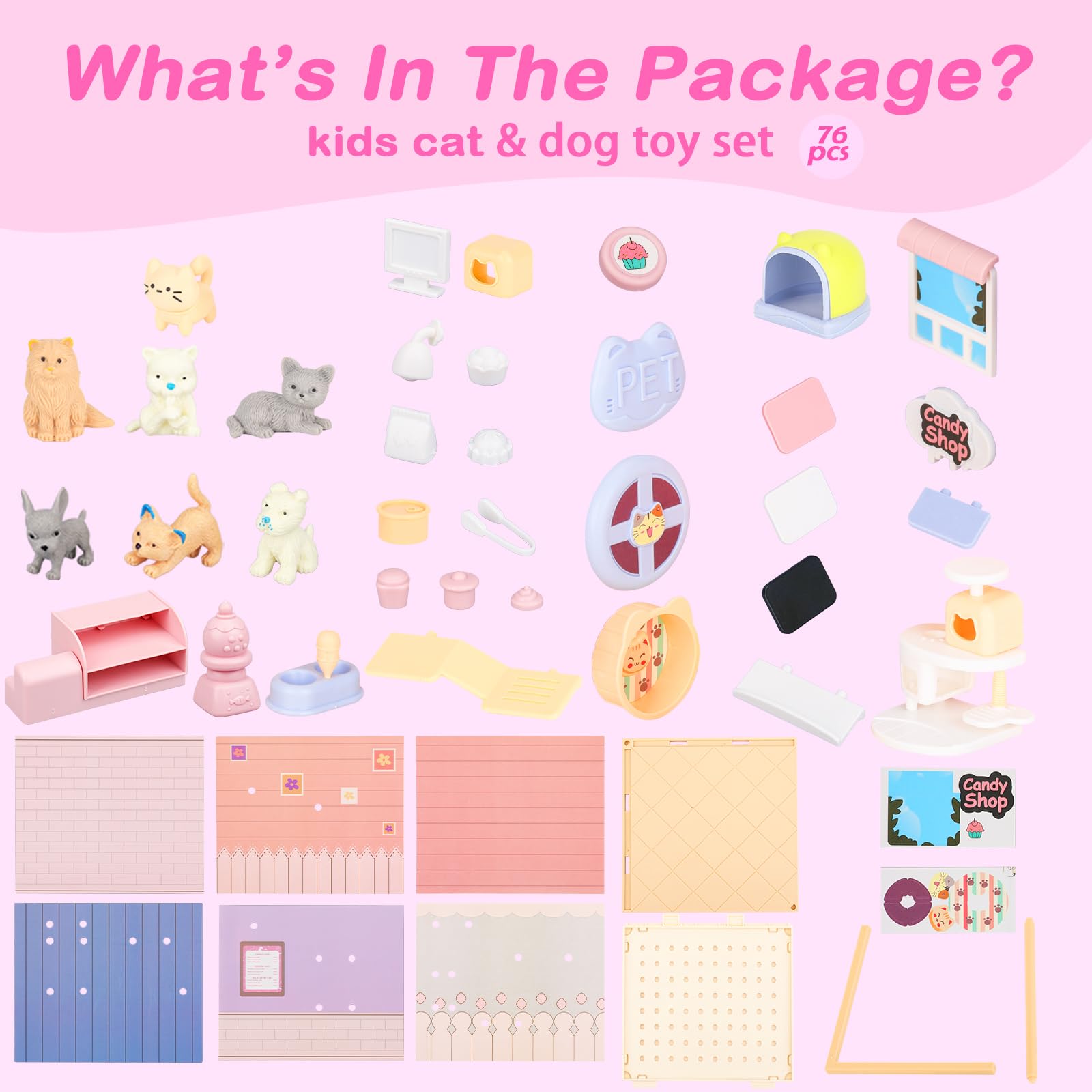 TQQFUN Cat Toys for Kids, 76 Pcs Cat and Dog Pretend Play Figures Playset, Toddlers Gift Interactive Role Play with Cake Treats,