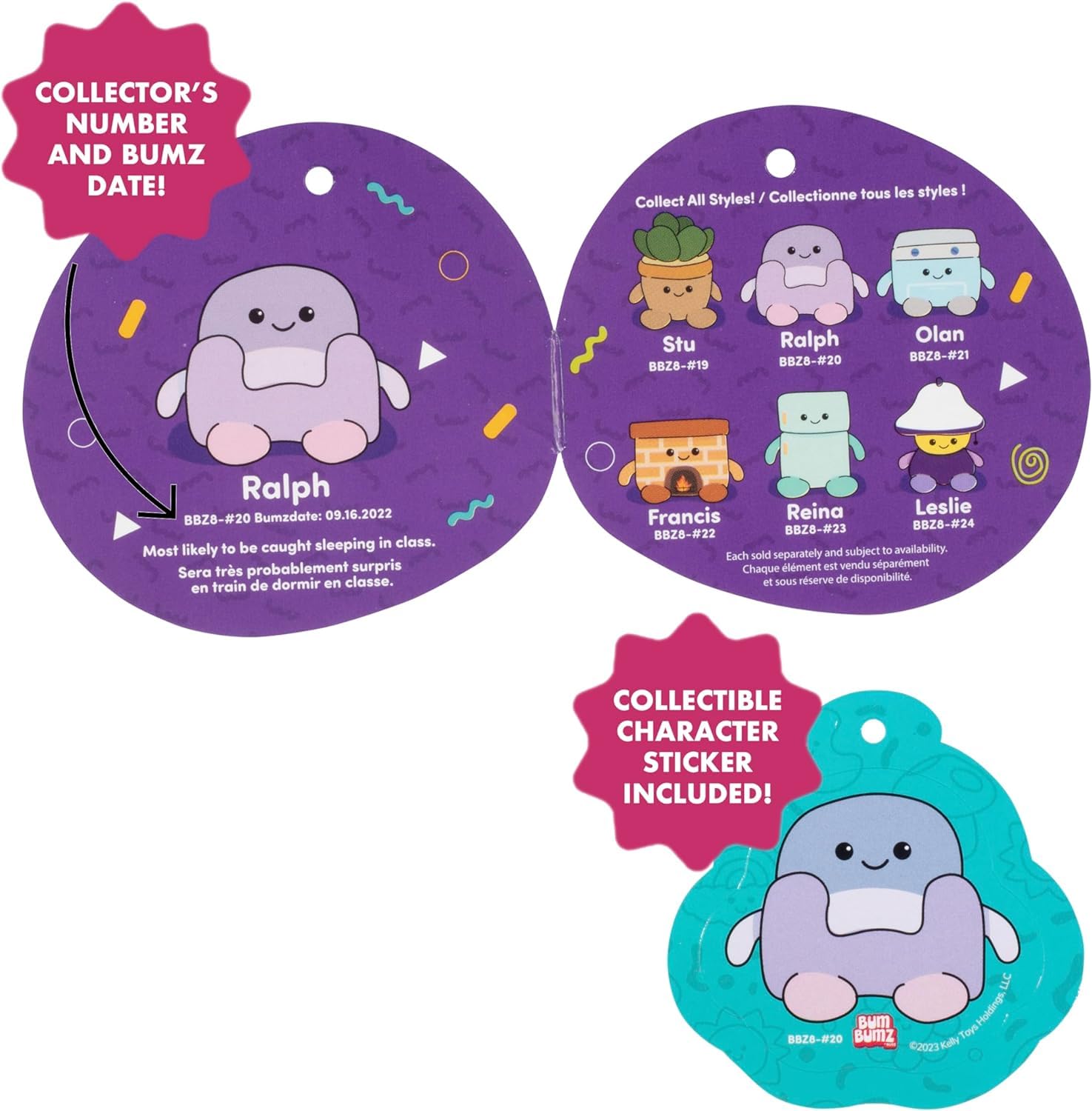 Meet Recliner Ralph & Succulent Stu! These BumBumz plush toys are a bean bag of cuteness. Soft and squishy plush HomeBumz are shaped like household items! With a soft, squishy body shaped like a recliner chair and succulant plant, these BumBumz plush toys are designed after real life everyday objects! Anything in the world can become a BumBumz! Collect them all! Each Bumbumz features a collectible holographic character sticker on their tag and a unique icon for each series! Perfect for boys and girls of all ages! Makes a great gift for kids who love Russ stuffed animals! These authentic quality plushie figures are perfect gifts for Christmas, birthdays, Easter, holidays, Valentine's Day, stocking stuffer, basket stuffer and more! Officially licensed BumBumz merchandise. Set of 2. Polyester. Measures approximately 7.5 inches.
