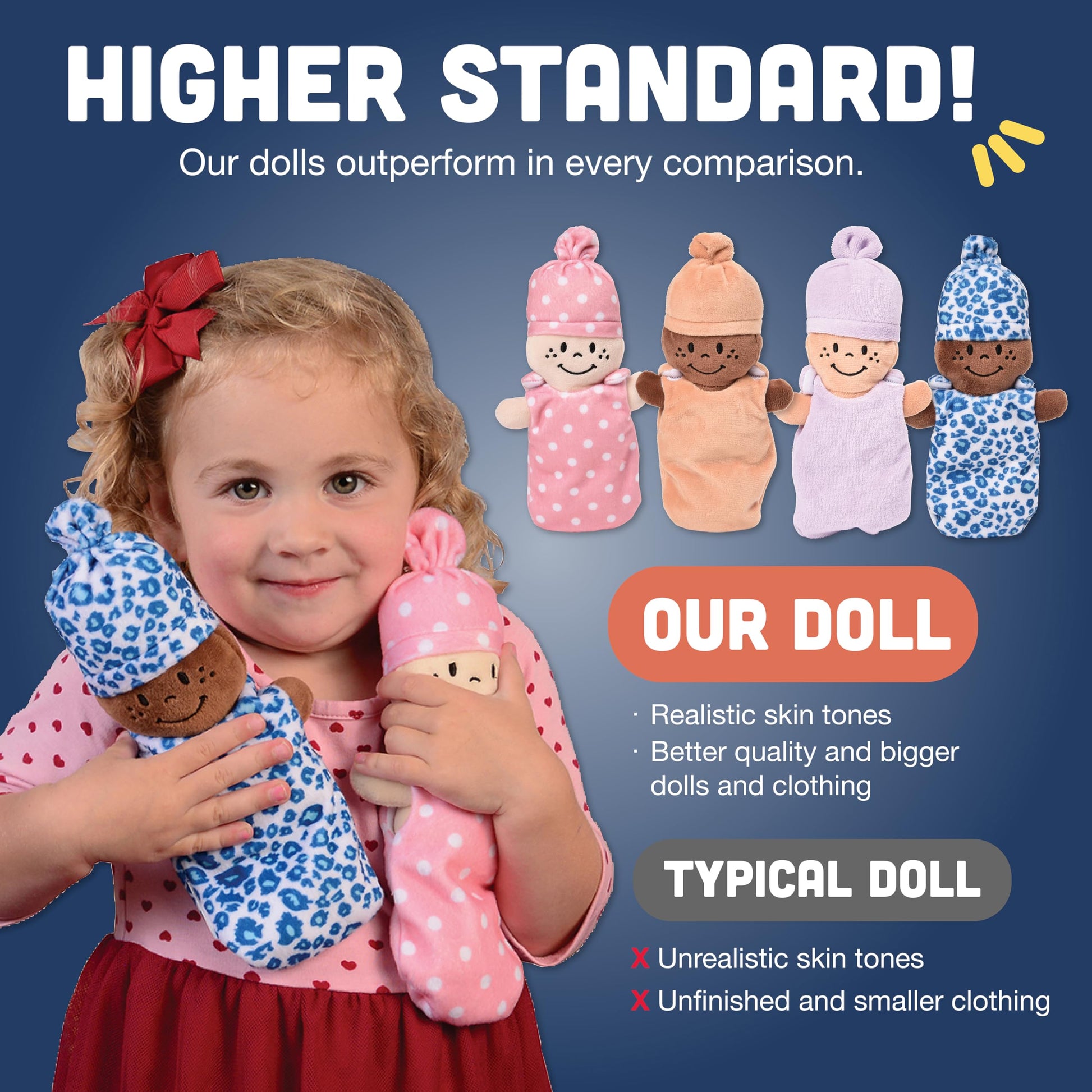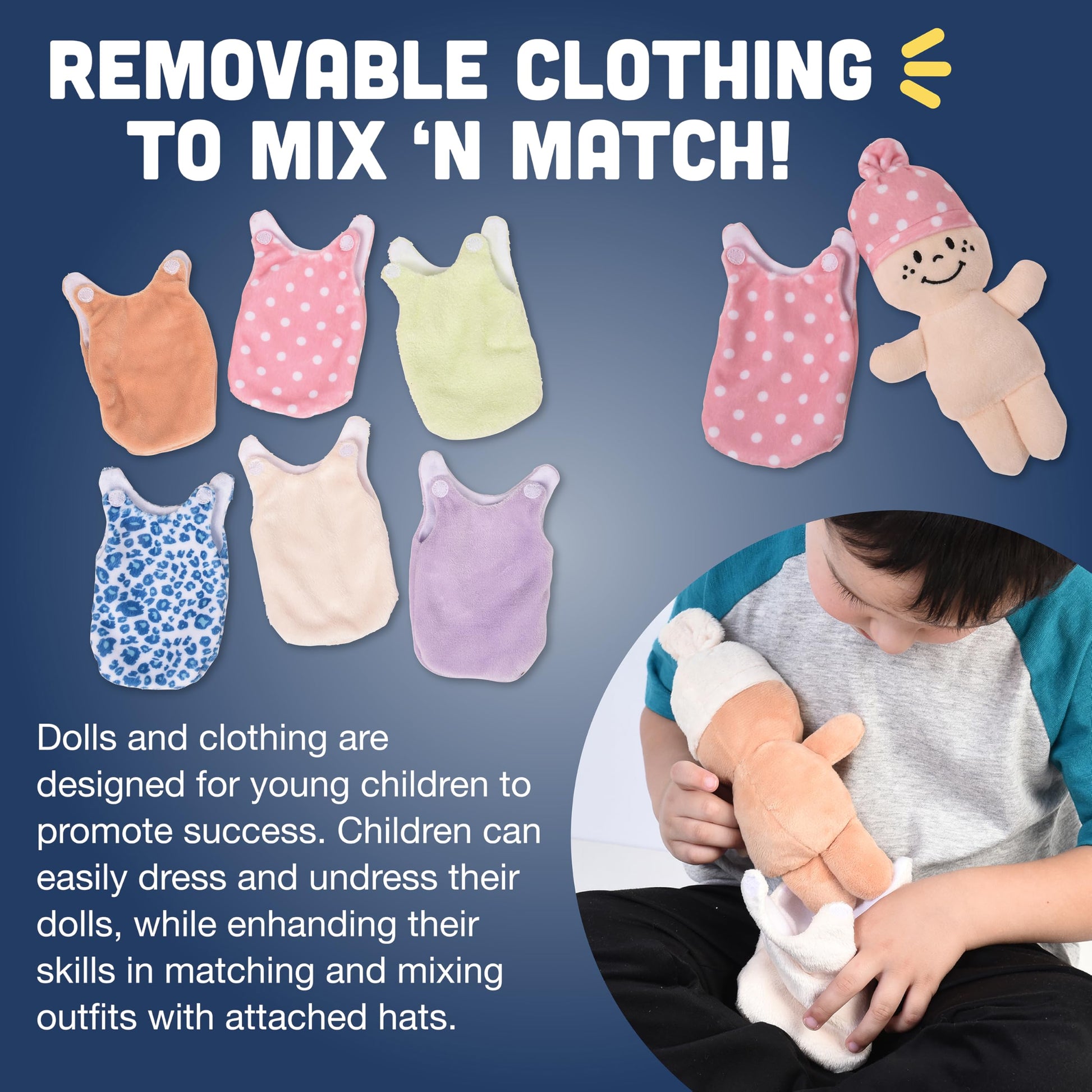 Teach your child the importance of diversity and tenderness in a fun way with the Creative Minds Basket of Babies Plush Doll Set. With six culturally diverse baby dolls, each adorned in permanently affixed cloth caps and matching removable sack onesies with a soft and comforting fabric, this multicultural plush baby dolls set is a playful introduction to empathy and multicultural understanding for infants, toddlers, and young children. Its great for playtime around your house, daycare centers, classrooms, or even child therapy sessions. These cuddly companions are housed in an equally-soft plush doll basket, making clean-up and storage a breeze. Your children will love to snuggle, cuddle, and play with each of these sweet stuffed baby dolls while they fine-tune their motor, creative, and social skills. Each baby doll plush toy in this collection is hand sewn with care and ready to withstand years of hands-on engagement and love. Each 9 doll is happily nestled in their cozy, 12 wide take-along toy basket, making this toy doll set a wonderful Christmas, Easter, or birthday gift.
