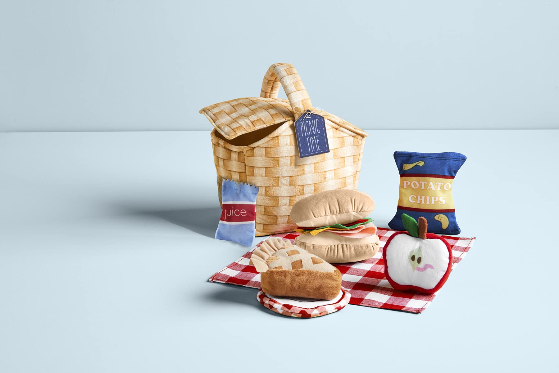 7-piece set. Interactive plush picnic blanket includes sandwich, apple, juice box, pie, plate and bag of potato chips with kid-friendly crinkle noises.