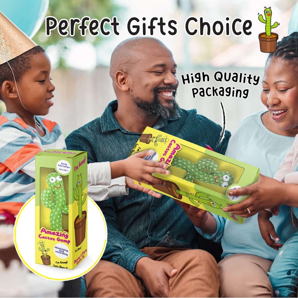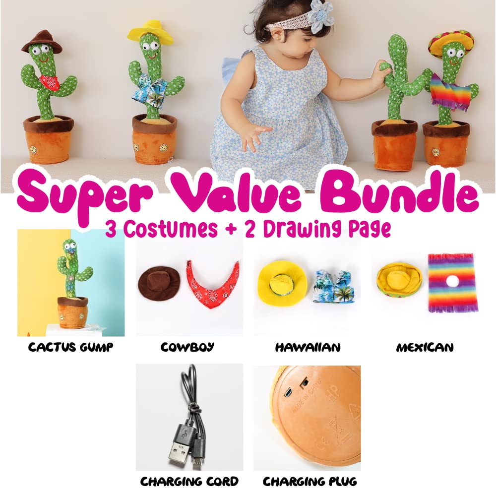 A FUN WAY FOR CHILDREN TO LEARN IN THEIR EARLY YEARS If you want a toy that can guide your child through his early years, then this cactus toy should probably be on top of your list. A TOY SET THAT CAN DO MANY THINGS With just one cactus toy, you get your child a talented best pal! What can this toy do? Well, what can it not! This toy set comes with so many features that youll surely feel the value of your money returned ten-fold with the following features: 1. Mimicking and Imitating! Everybody likes a talking toy, and this one can! With this feature, you can make this cactus toy repeat what you said. It can either be a sweet message for a friend or simple affirmations for your child. 2. Singing and Dancing! This toy can sing 60 songs of varying languages which will be very helpful for a child that is still learning how to talk. You can switch to different songs anytime depending on what you want to listen to. While it plays the songs, this cactus toy will dance, wiggle, and glow! 3. Drawing and Painting with Drawing Pages! Want to expand your childs creativity? You can do that with the Toy Sets Drawing Papers too! Coloring, drawing different cactus faces, its up to your childrens imaginations! SAFE, EASY, AND PERFECT FOR THE FAMILY With its cotton material and non-removable rechargeable battery - you wont have to worry about your familys health and safety with this toy! The soft cotton makes it a comfortable toy for your children to carry through their growing years. However, because this cactus toy does have some small parts, please supervise children under 3 years old when they play with it. WHATS IN THE BOX: 1 CACTUS TOY + 2 DRAWING PAGES + 1 Product insert 1 USB Cable with Usage Guidelines and Song Lists