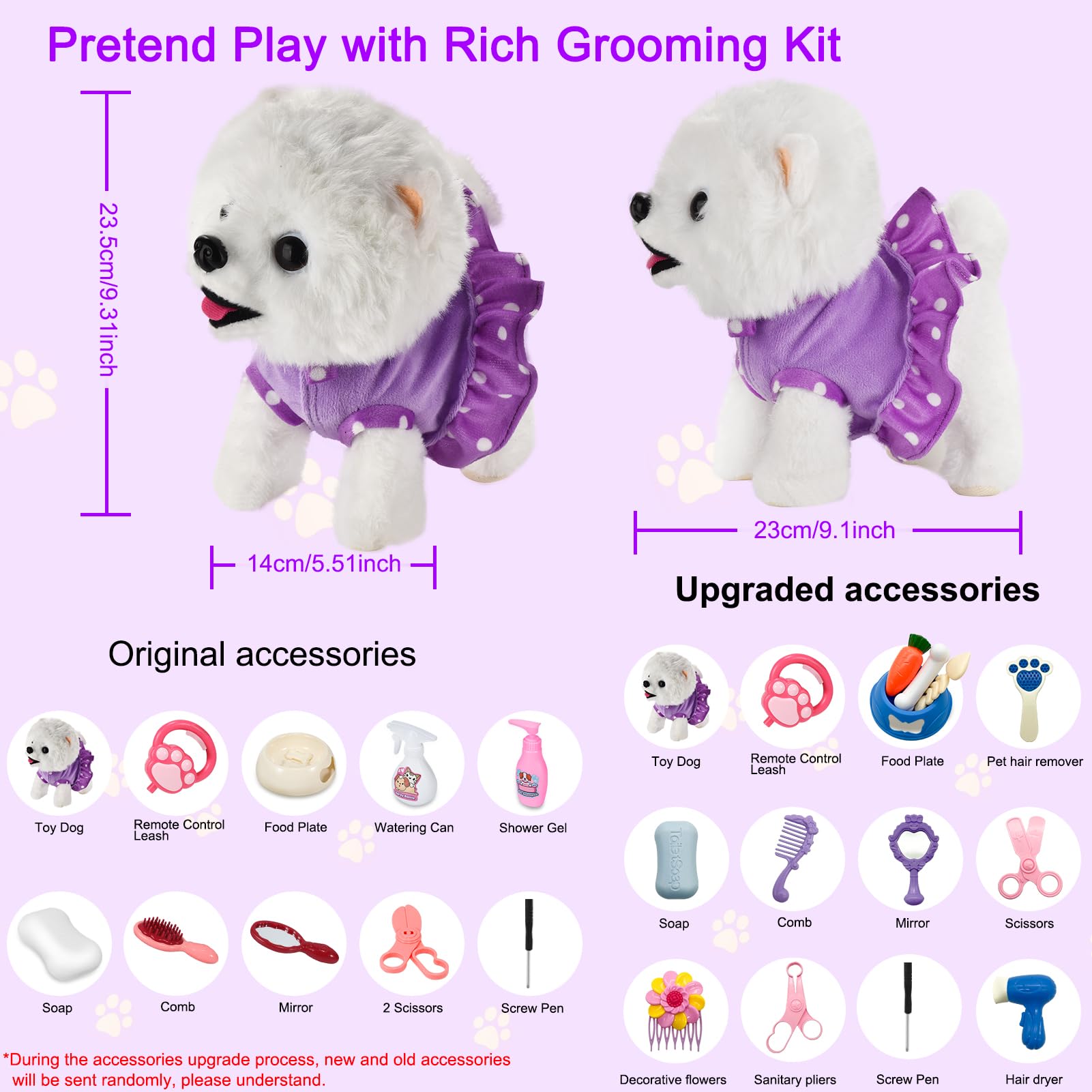 Unleash Their Imagination - With lifelike walking, barking, and tail-wagging, this toy offers an enchanting pet companion for imaginative adventures. Kids can take their pet for a walk, just like a real dog Comprehensive Grooming Tools - Provide a full grooming experience with shower gel, soap, comb, and scissors. Kids can engage in pretend bathing and grooming sessions, enhancing their caregiving skills Ownership and Responsibility - Let them experience the joys of being a pet owner, teaching them about responsibility and empathy. With the leash, they can learn how to take care of their toy dog during walks Interactive Fun for Hours - The set includes a mirror, screw pen, and various grooming tools to keep them engaged for hours, both indoors and outdoors. Its the perfect way to encourage active play Educational Joy - This gift combines the excitement of play with educational value, teaching kids about pet care basics while providing endless entertainment. Parents will appreciate the valuable life lessons