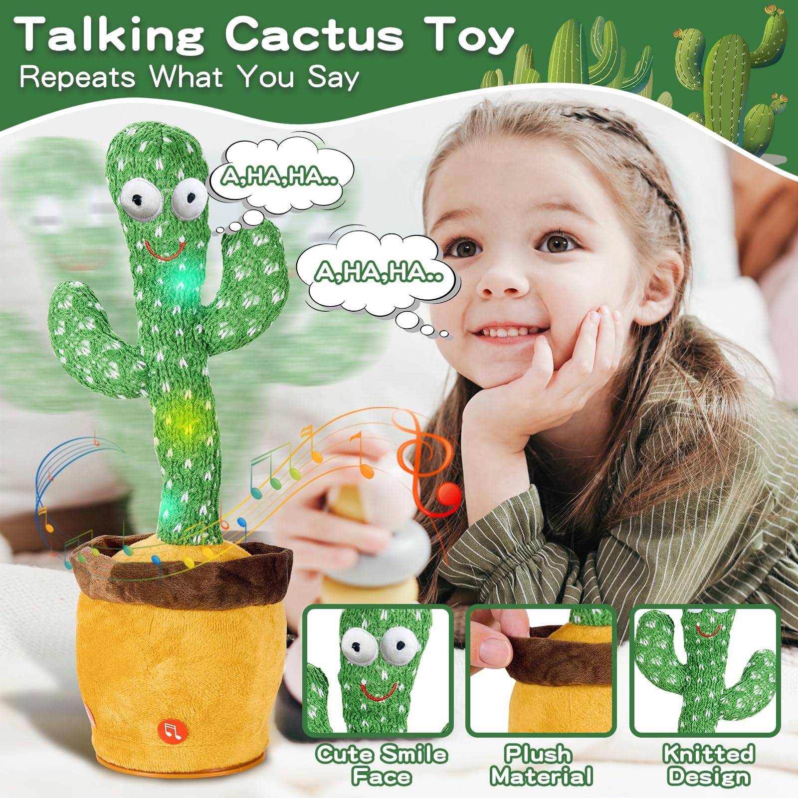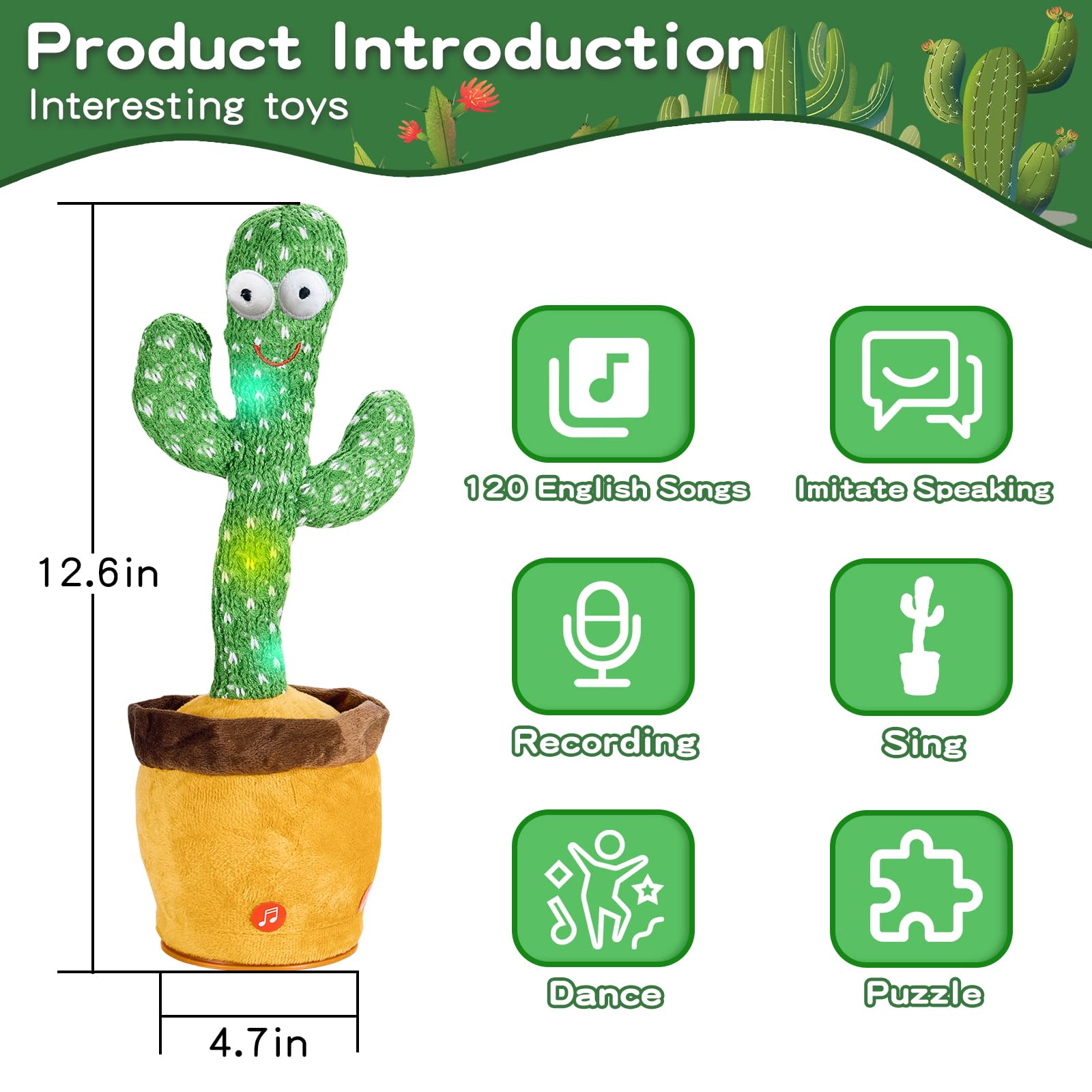 - Q: What unique features does the cactus toy have? A: The JAKCJFII Dancing Talking Cactus Toy features 120 English songs, the ability to record and mimic speech, and emits colorful LED lights while dancing or singing. These features not only entertain children but also create a joyful atmosphere in any room.