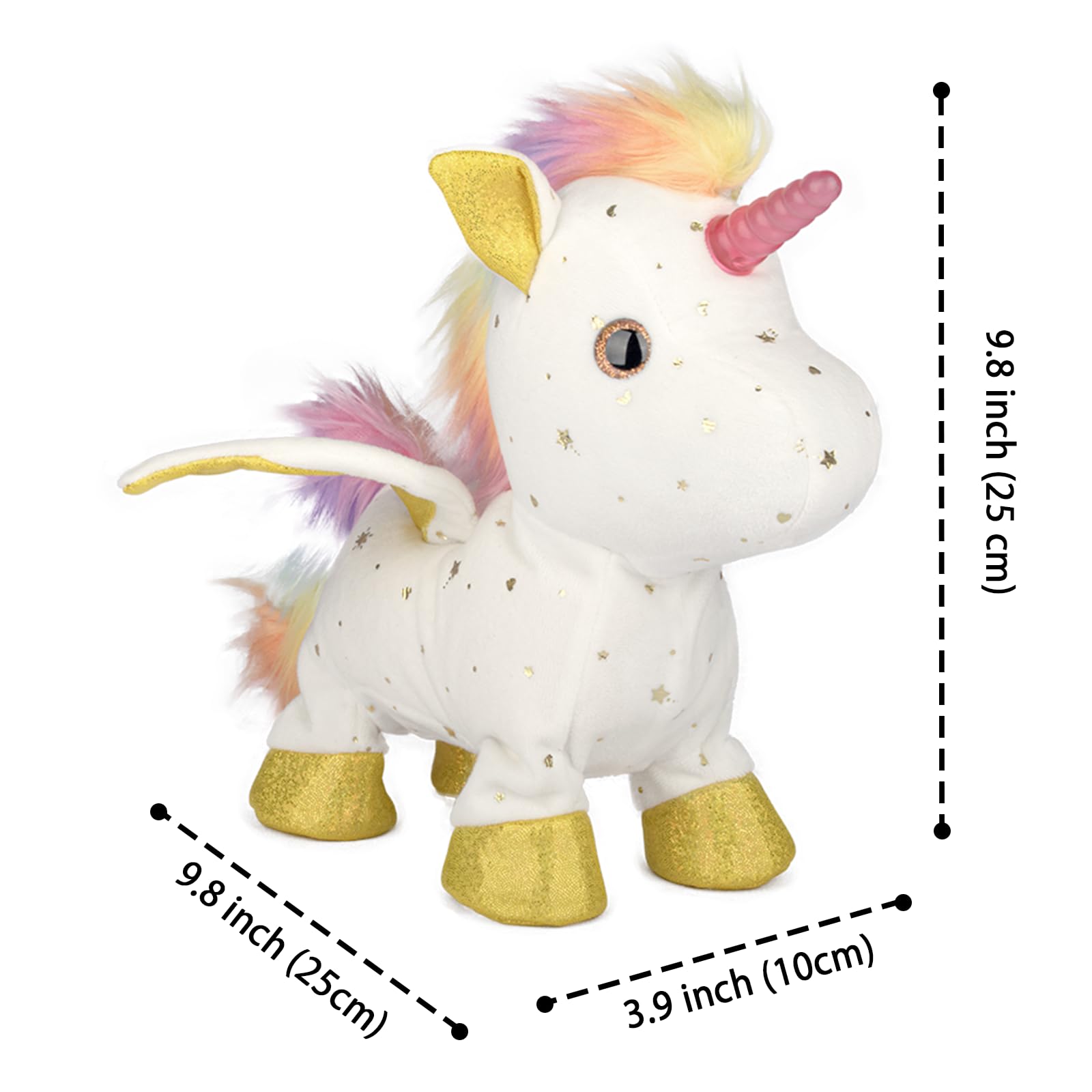 Bring magic to life with this enchanting interactive unicorn plush toy that walks, flaps its golden wings, and features a mesmerizing light-up horn. Perfect for imaginative play, this soft and cuddly companion can be guided using the included remote control leash, allowing children to take their mystical friend on delightful adventures. The unicorns graceful movements and illuminated horn create a captivating experience that will spark joy and wonder. Its plush exterior is soft to touch, making it an ideal cuddle buddy for bedtime or playtime. The remote control feature gives children the exciting ability to lead their unicorn wherever their imagination takes them. This interactive toy makes an extraordinary gift for young unicorn enthusiasts, combining the charm of a traditional stuffed animal with engaging features that bring the fantasy to life. The golden wings add an extra touch of sparkle and whimsy to this already magical creation.