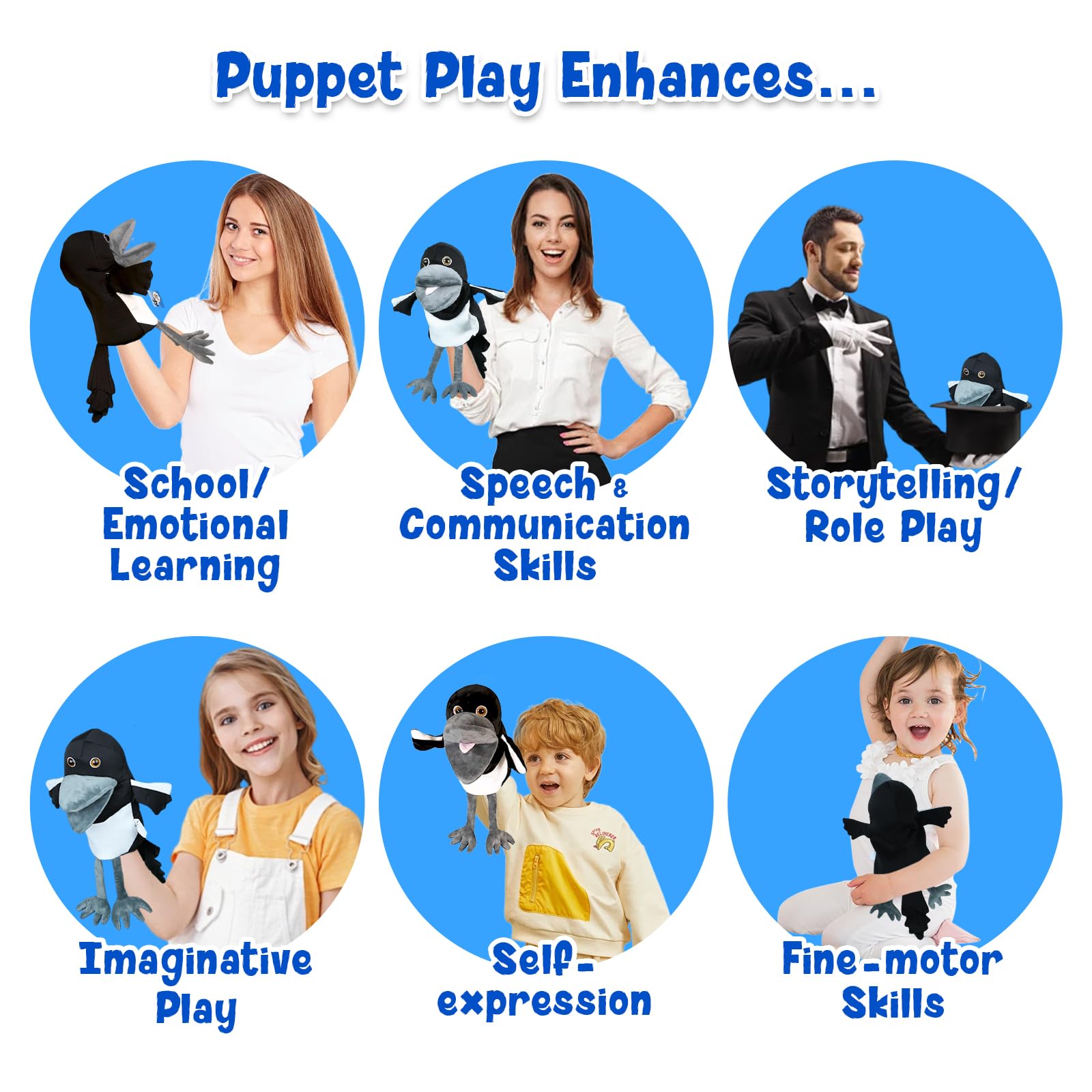 - Q: What types of play does the Maggie Magpie puppet encourage? A: This puppet promotes interactive and imaginative play, helping improve motor skills, hand-eye coordination, emotional expression, and communication through storytelling.
