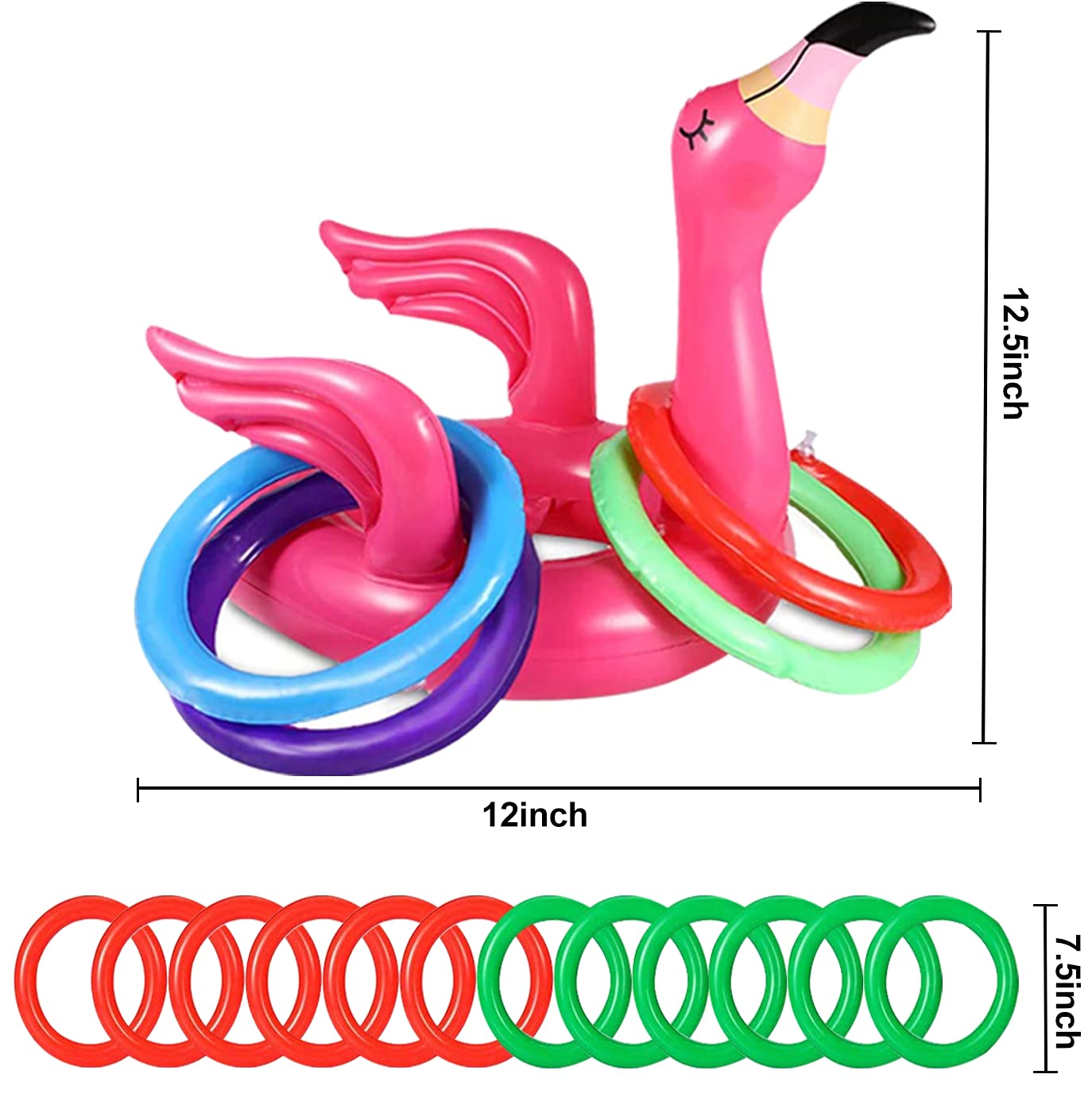 15 Pcs Inflatable Flamingo Ring Toss Game (3 Inflatable Flamingo, 12 Inflatable Rings) - New Design Ring Toss for Boys Girls Birthday Party, Pools Party or Any Carnival flamingo ring toss.Inflatable flamingo ring toss game is a funny pool game that can be played in many ways:GAME 1: One player wear the flamingo on head,others players toss the rings to the flamingo's wings or neck.GAME 2: Players wear this inflatable flamingo on their head and stand face to face, then throw their rings toss to the wings or neck of the flamingo.The winner is who with the highest number of rings on the flamingos' necks or wings.Enjoying the funny time with Friends and FamilyThrough team games with friends and family, kids can improve their interpersonal skills, and learn some lessons about team work, a child can understand the criterion of competition: friendship first, competition laterSpecifications:- Material: Environmental PVC- Size: Flamingo 12.5'' x 12''. The outer diameter of the ring is 7.5 inch.- Quantity: 15 Pcs (3 pcs inflatable Flamingo and 12 pcs inflatable toss rings)- Where to use: in the water, on the ground, on the lawn or wear it on your head.- Recommend: 3 years old up kids and adults.Notice:- Keep away from sharp objects and hot object to prevent puncturing and melt.