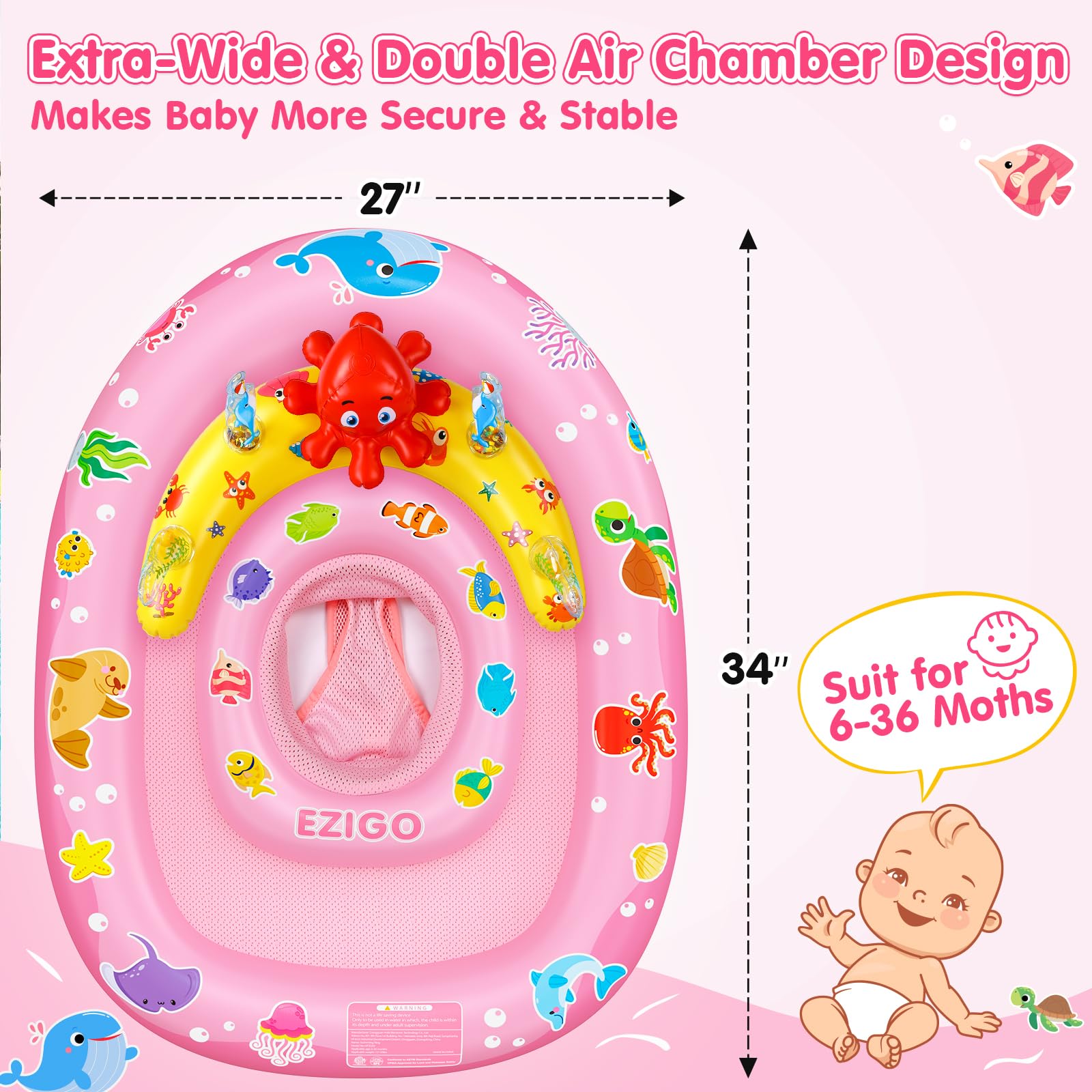 EZIGO Baby Pool Float with Canopy UPF50+ Sun Protection, Inflatable Kids Pool Float with Ocean Animal Toys for Baby 6-36 Months, Infant Swimming Float with Adjustable Safety Seat for Boys Girls - Pink