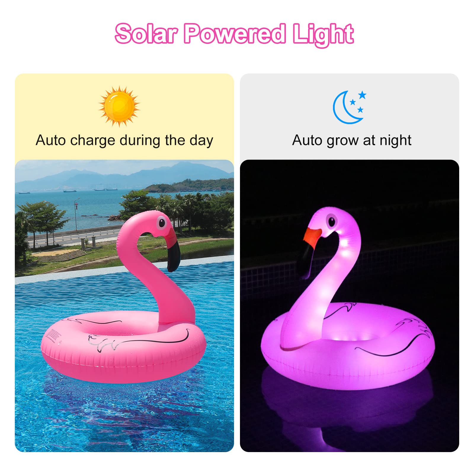 - Q: How does the solar-powered lighting work on the Flamingo Inflatable Pool Float? A: The solar-powered lighting on the Flamingo Inflatable Pool Float charges during the day when exposed to sunlight. Once fully charged, the lights automatically turn on at night, providing a beautiful glow that enhances your pool experience for up to 6 to 8 hours.