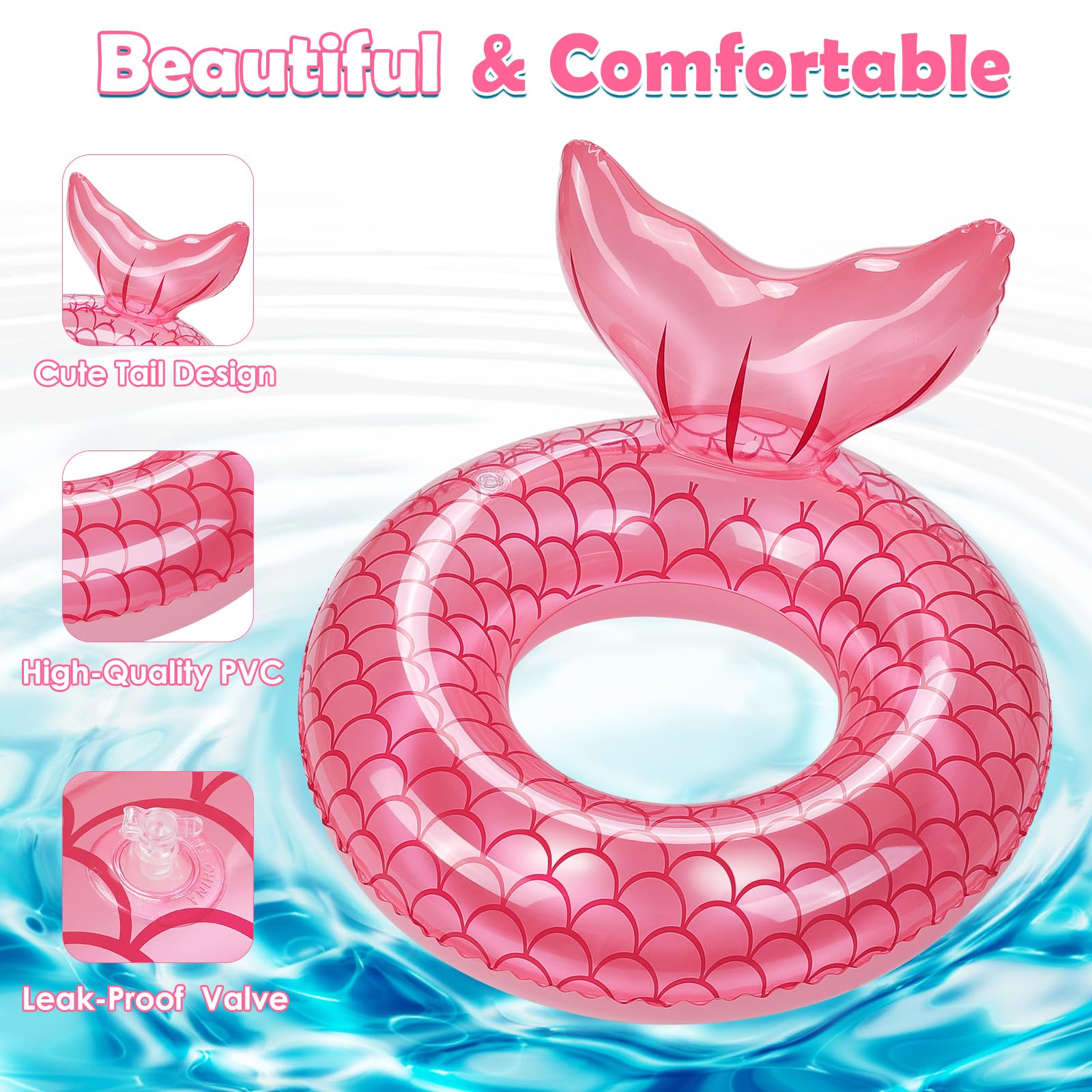 HeySplash Inflatable Swim Rings--The unique mermaid tail-shaped swim ring with special color is full of fun, it is your ideal choice for leisure and entertainment.--Made of high-quality PVC material, durable and safe. It is ergonomically designed to provide sufficient support and comfort. The ring floatie can bear a weight of 38-88 pounds.--The air nozzle is designed with internal and external double leak-proof design, making this swimming ring not easily leaky. The valve can be fully opened to deflate within a few seconds.-- You can take it to the beach, swimming pool, or party, and share the happiness with others. Suitable for oceans, lakes, rivers, swimming pools, and party decorations. Enjoy your water fun beach party.Package Contents:1 x Swim Ring