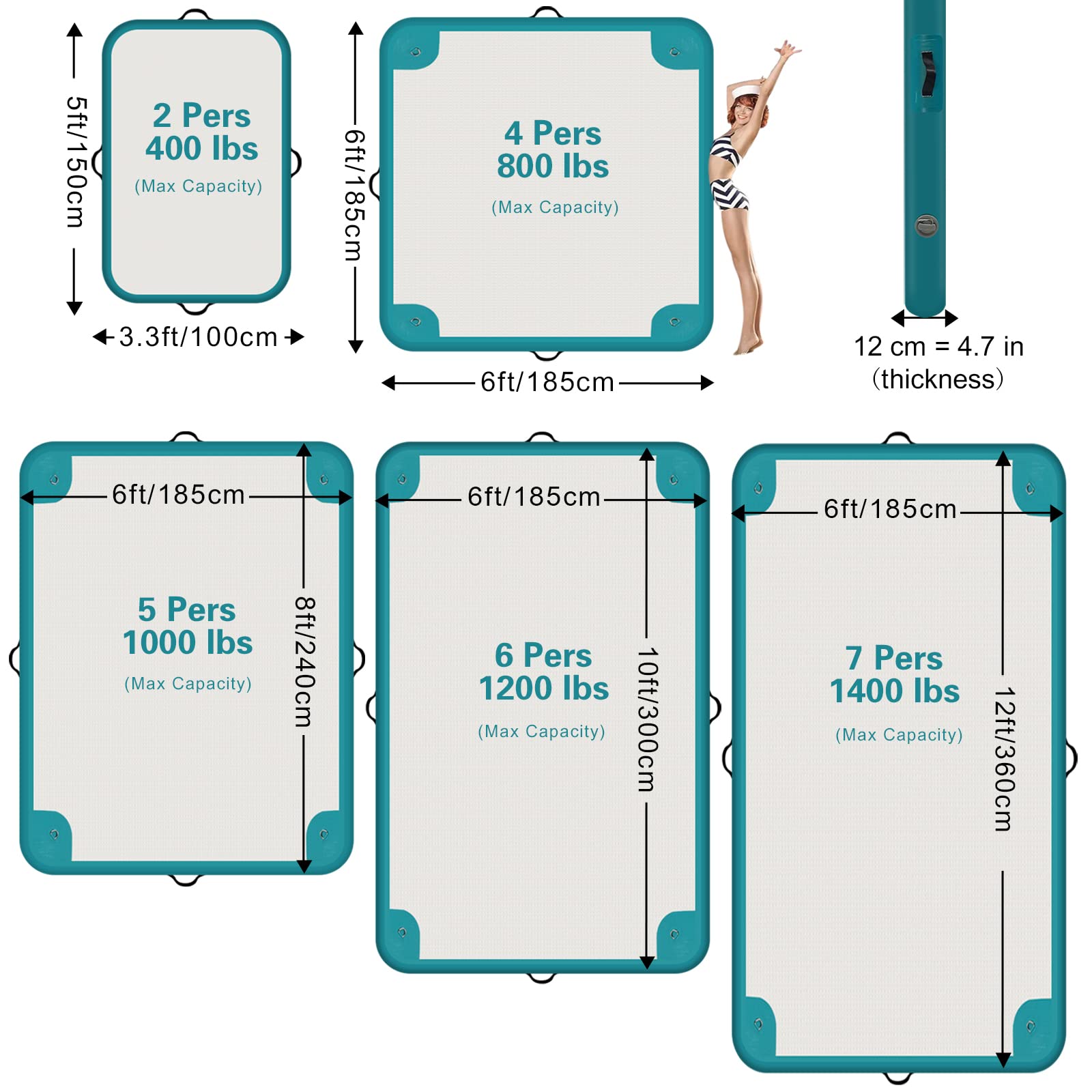 - Q: What is the weight capacity of the AZXRHWYGS Inflatable Floating Dock? A: The AZXRHWYGS Inflatable Floating Dock platform has various sizes to accommodate different weight capacities: 5 ft x 3.3 ft can hold up to 400 lbs, 6 ft x 6 ft up to 800 lbs, 8 ft x 6 ft up to 1000 lbs, 10 ft x 6 ft up to 1200 lbs, and 12 ft x 6 ft up to 1400 lbs.