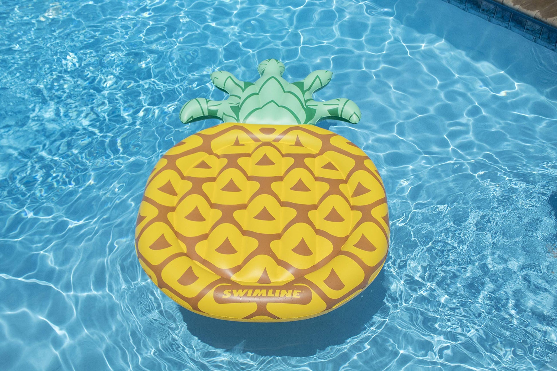 Float away to your Tropical happy Place with the Swimline giant inflatable pineapple pool float. With this float, you are all set for the sweetest summer of your life. It has a cool and unique Print top and adds a splash of paradise to your water festivities. It's roomy enough for up to 2 adults and is made of heavy duty vinyl construction for many delicious summers ahead.