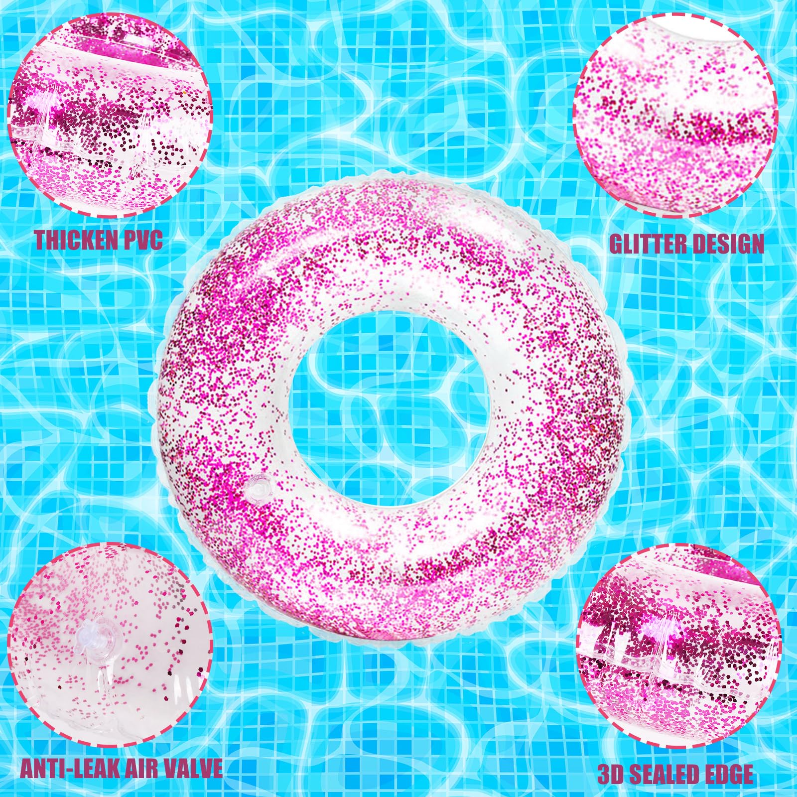 Whaline 4Pcs Inflatable Pool Floats Toys Clear Swim Tubes Rings Glitter Hot Pink Pool Tube For Teen Boys Girls Outdoor Summer Sw