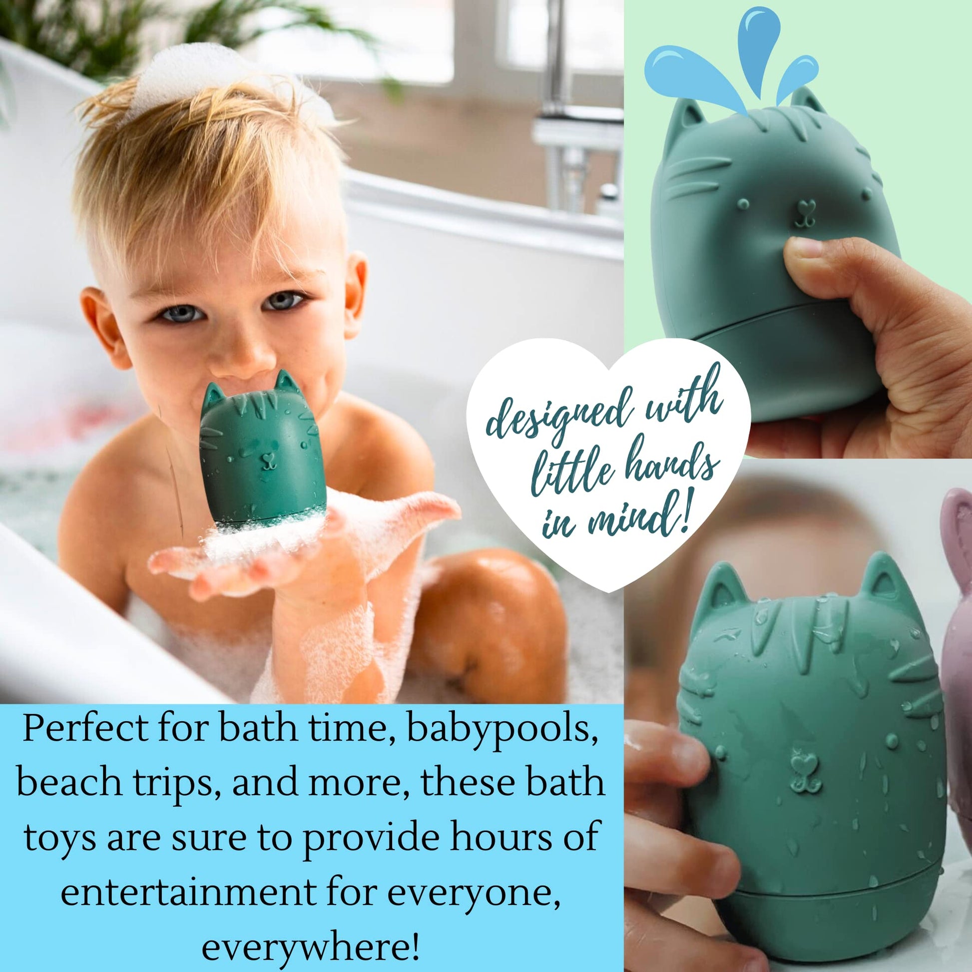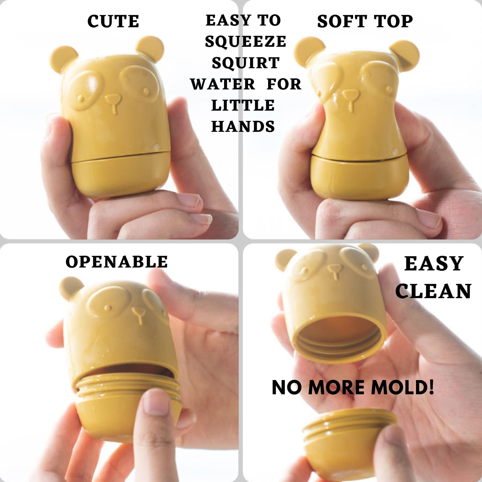 Mold Free: Say Goodbye To Moldy Bath Toys! Easily Separate Top And Bottom Of Each Toy To Properly Clean & Dry, Preventing Mold From Forming.Safe And Durable: Made From High Quality Food Grade Silicone. These Bath Toys Are Designed With No Small Parts And Have A Soft And Pleasant Texture That Kids Love. It Safe For Babies To Hold And Put In Their Mouths.(++Teething Friendly++)Non-Toxic: Free Of Bpa, Pvc, Phthalates, And Latex.Dishwasher Safe + Easy To Clean: Our Silicone Toys Can Be Opened, To Be Cleaned On The Top Rack Of A Household Dishwasher.Floats & Squeeze & Squirt: Squeeze And Squirt In The Bath For Extra Bath Time Fun! Mix And Match The Tops And Bottoms For Creative And Inventive Playincludes: 1 Organic Cotton Storage Bag + 4 Toysnote:Whether It Be The Bath Or The Pool, These Are Great Fun For Any Water Activity. Our Recommended Age Is 6 Months - 6 Years But Even Older Kids Enjoy Playing With Them.Bumble Bear Silicone Bath Toys Bumble Bear Animal Themed Silicone Bath Toys Are Our Latest Innovation For Bath Time. Our Design Brings Fun And Excitement For Your Baby Or Toddler While Keeping Them Engaged And Entertained. The Silicone Is Soft To The Touch And Easy To Hold For Tiny Hands With No Sharp Edges. The Squeeze And Squirt Feature Will Provide Your Baby With Plenty Of Laughs And Giggles. Each Bath Toy Measures 2.8 Inches (7 Cm) From Top To The Bottom Without The Ears, So They Are Sized Just Right For Little Hands To Grasp And Squeeze. They'Re Also Durable, So You Don'T Have To Worry About Chipping Or Breaking. Add These Bath Friends To Your Bath Time Mix And Watch The Adventures Unfold! Our Detachable Design Allows For Simple Cleaning As Well As Air Drying To Prevent M0Ld Growth On Both The Inside And Outside Of The Toy. For That Extra Clean They Are Top Rack Dishwasher Safe.