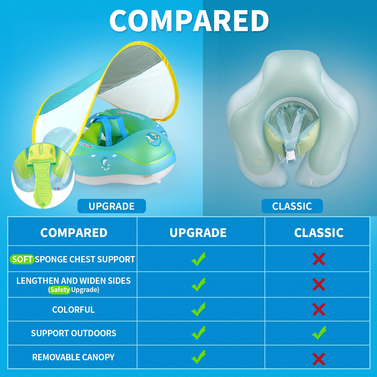 - Q: What features enhance the safety of the float? A: The float features a non-inflatable sponge chest support to protect the baby's belly and wider sides to prevent flipping. These design elements prioritize safety.