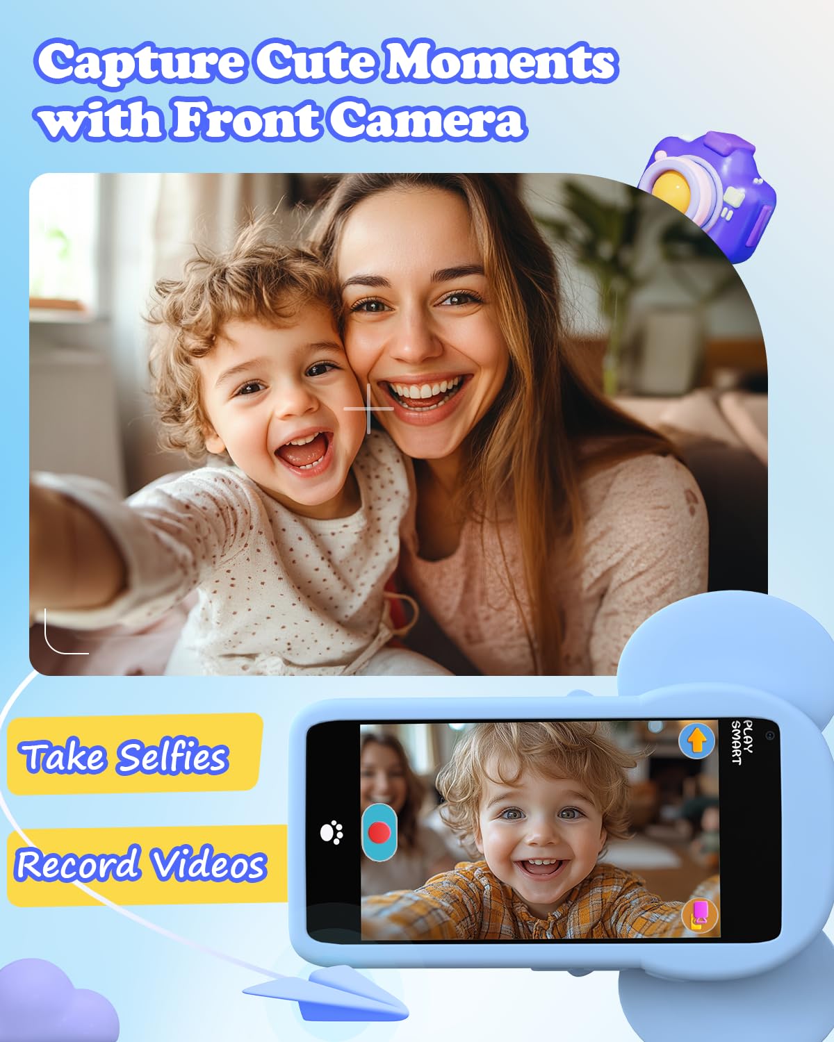 Multifunctional Kids Smart Phone, with a 3.97'' eye-friendly touchscreen, blends fun and learning for ages 3-12. Packed with 200+ games, early education tools, drawing, stories, and music options, it fosters creativity and development. Equipped with a 1500mAh battery and lanyard, its portable for adventures, while front and rear cameras let kids capture special moments. Advanced parental controls allow parents to set limits and monitor content. With 5 stories and 21 sleep sounds, its ideal for bedtime and travel. A perfect Birthday or Christmas gift, this durable toy phone keeps kids safely entertained.