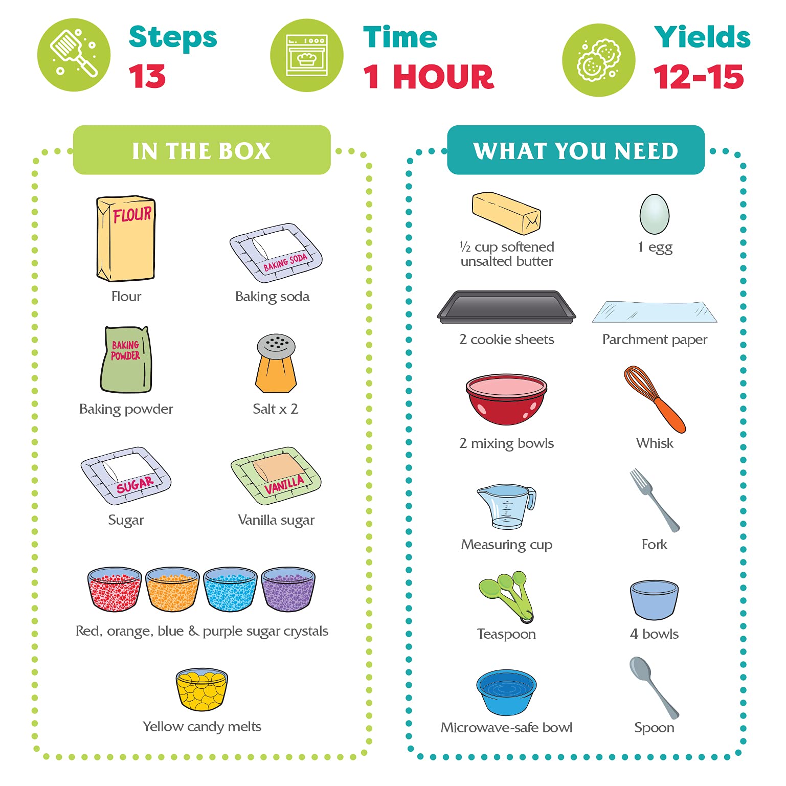- Q: What ingredients are included in the Baketivity Kids Baking Set? A: The kit comes with all the pre-measured dry ingredients needed to make Pretty Petal Flower Cookie Bites, as well as a complete grocery list for any additional items.
