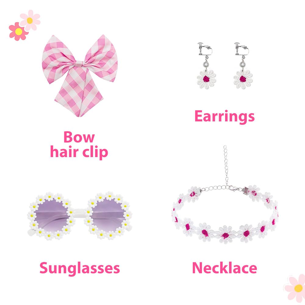 This Girls Pink Costume is designed based on retro fashion elements. When your girl wears this dress that restored the Costume of 70s and 80s, your girl will stand out in the crowd with this unique and trendy ensemble. It is a gift for your little cosplay fan. | The Checkered dress is crafted from soft and breathable fiber. Features an elegant pearl belt for a vintage touch, and adjustable shoulder straps ensure a perfect fit. Side zipper design for easy wearing and removal, making it ideal for everyday wear. | Package Included:Pink Plaid Dress, bowknot Hair Clip, Pearl buckle Waistband, Daisy glasses and necklace, Clip-on daisy earrings. A must-have addition to your little fans wardrobe. | Perfect for imaginative play and costume parties, role play, halloween cosplay, party event, school play, video shooting, christmas, carnival, performance, this Pink Costume Dress is sure to be a hit with your little ones. | Warm Tips:The Pink Cosplay Dress Up for girls, Suit for 4-13 Years girls. And age is only an approximation of size. Please measure the actual body size and refer to the Size Chart to choose a proper size for best fit.