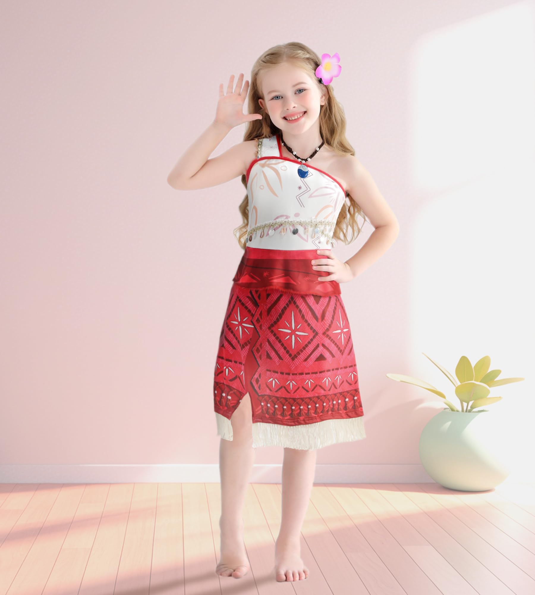 Set includes: one shoulder princess dress, wreath, flower hair clip and necklace. Complemented by a flower wreath and a flower hair clip, your little girl will look every bit the adventurous princess. The necklace adds a finishing touch, completing the look with elegance and charm | Fabric: Crafted from polyester fabric, this princess dress is smooth and comfortable, ensuring your girl's comfort throughout the adventure | Design: This princess dress features a one-shoulder design adorned with a unique ethnic print and a fringed hemline, which creating a charming visual effect. The shell pendants design on the chest and shoulder adds a touch of cuteness and playfulness | Occasion: Perfect for Halloween, Carnival, Christmas, photo shoots, shows and birthday parties, this one shoulder fringe princess costume makes a surprise gift for girls. Let your little girl have fun adventuring in the world of imagination in this adorable princess costume | Present: Make a memorable present with this ocean princess costume, a perfect present for girls who love to embody their favorite characters. Whether it's a themed party or a dress up day, this princess dress will bring your girl joy as well as make her braver
