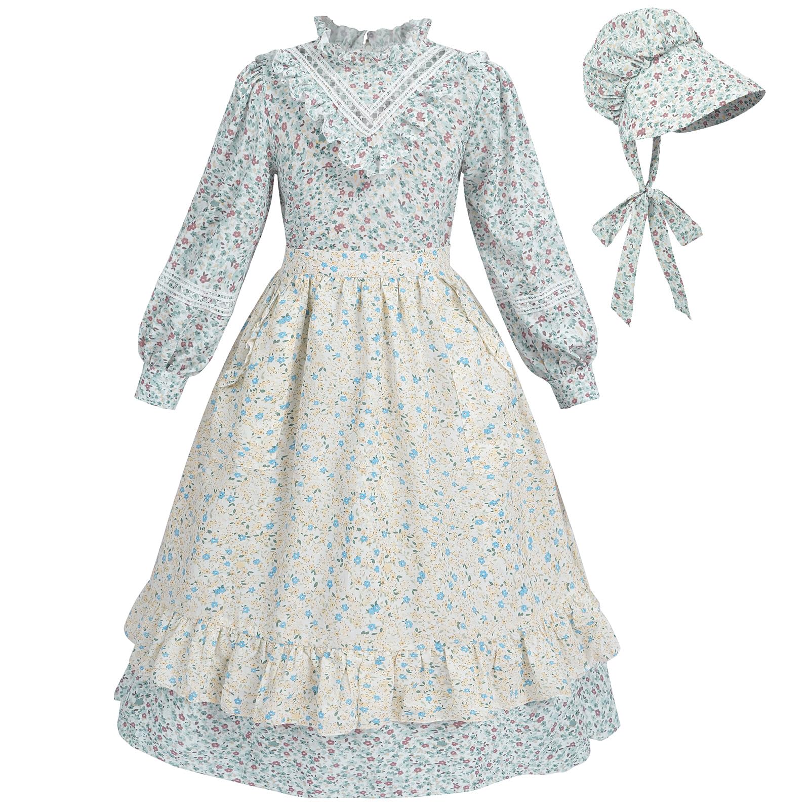 Fccam Prairie Colonial Dress Girls Long Sleeve Pioneer Dress Costume Floral Pioneer Girl Laura Ingalls Wilder Green Xl