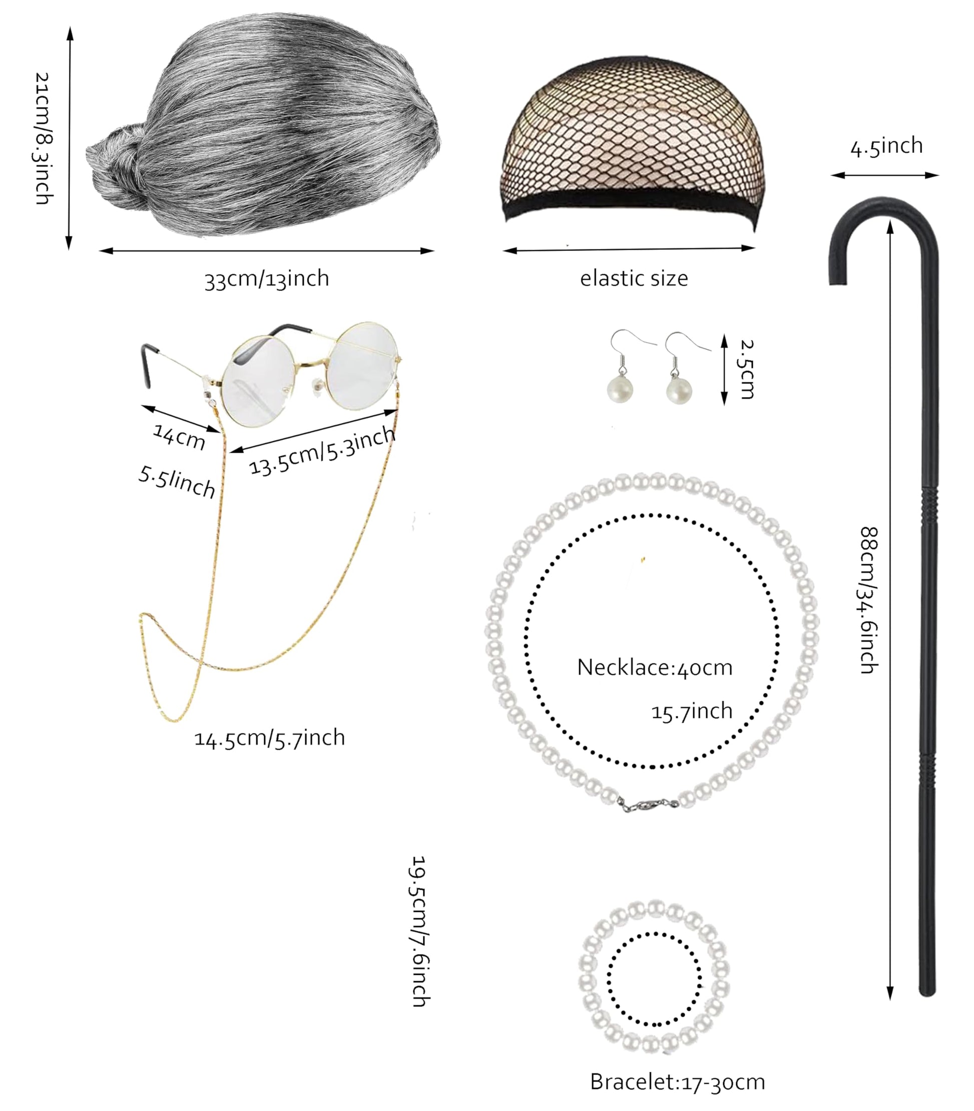 Package includes 6 pcs: 1 Wig with Curles and Wig Cap,1 Cotton Dress,1 Glasses with Chains Strap, 1 Cane,1 Necklace.