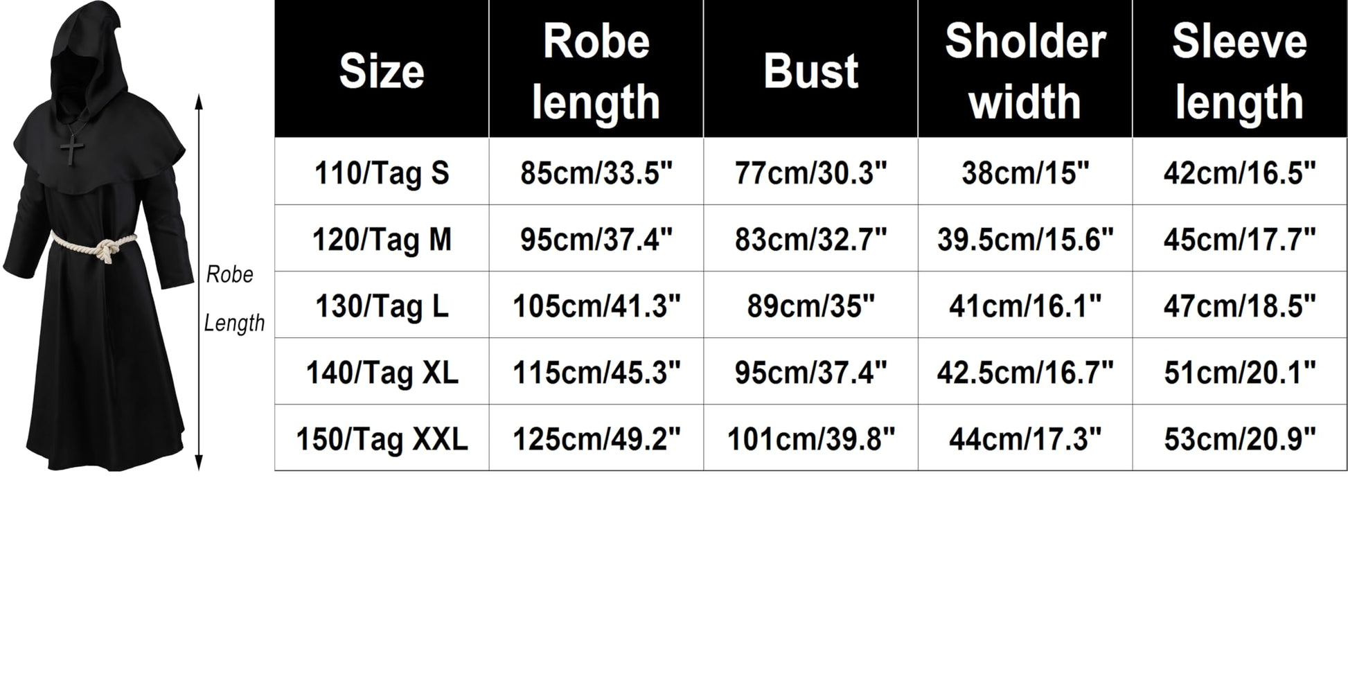 This kids' medieval hooded monk robe is inspired by a character from the movies. A man wearing the hooded monk robe, hiding his face, building up his strength with both hands, and possessing powerful magic or great power, looks very cool and mysterious. It's perfect for Halloween parties or other role-playing events. | Fabric: Uniform Cloth; Cross Necklace: Wood. This costume is crafted from deluxe polyester fabric for a comfortable wear during Halloween parties or themed events. | Order Including: Hooded Robe + Rope Belt + Cross Necklace. | The long, flowing hooded robe can be worn for various occasions such as Halloween, school events, cosplay parties, stage shows, masquerades, theme parties, and more. | Kids Medieval Friar Monk Robe Cosplay Hooded Cape Boys and Girls Costume Cloak For Halloween Parties.