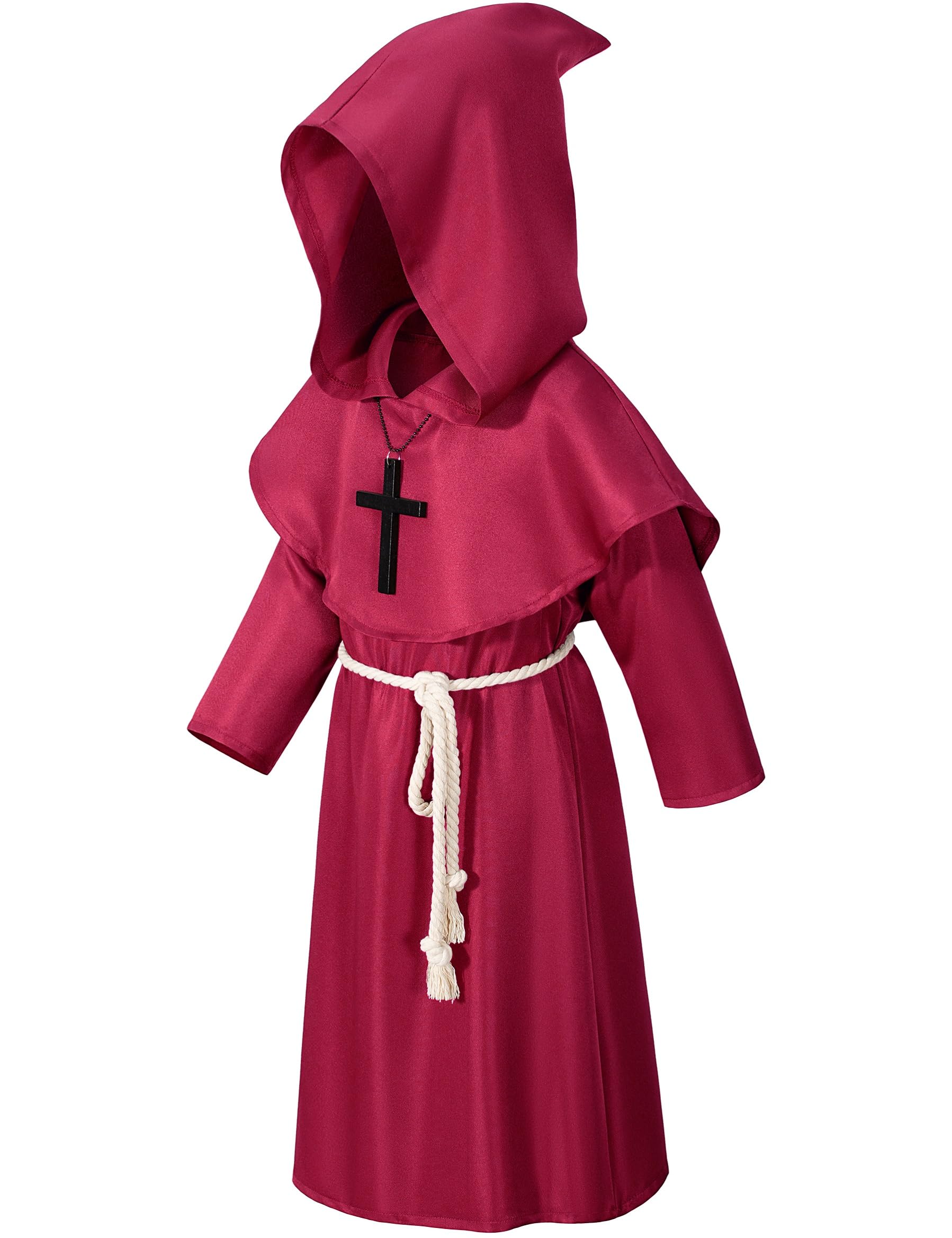 Tips:for best effect ironing before wearing. Boy's medieval renaissance preacher knight religious priest costume monk friar robe hooded halloween wizard cloak cosplay costume with cowl hat rope belt crosses necklace for kids. Perfect for:costume up,cosplay,medieval renaissance knight religious theme parties,prom,halloween,stage performance,renaissance faire,fantasy events,dress-up play,comic con,halloween cosplay party,reenactment activities,LARP and so on. Boys medieval renaissance hooded monk priest friar knight religious robe wizard cloak costume size information: Size 4-5 Years(tag 110):Length 29.1''----Bust 29.1''----Sleeve 14.6'' Size 6-7 Years(tag 120):Length 31.9''----Bust 31.5''----Sleeve 15.7'' Size 8-9 Years(tag 130):Length 35.4''----Bust 33.9''----Sleeve 16.9'' Size 10-11 Years(tag 140):Length 37.8''----Bust 36.2''----Sleeve 18.1'' Size 12-13 Years(tag 150):Length 40.9''----Bust 38.6''----Sleeve 19.3''