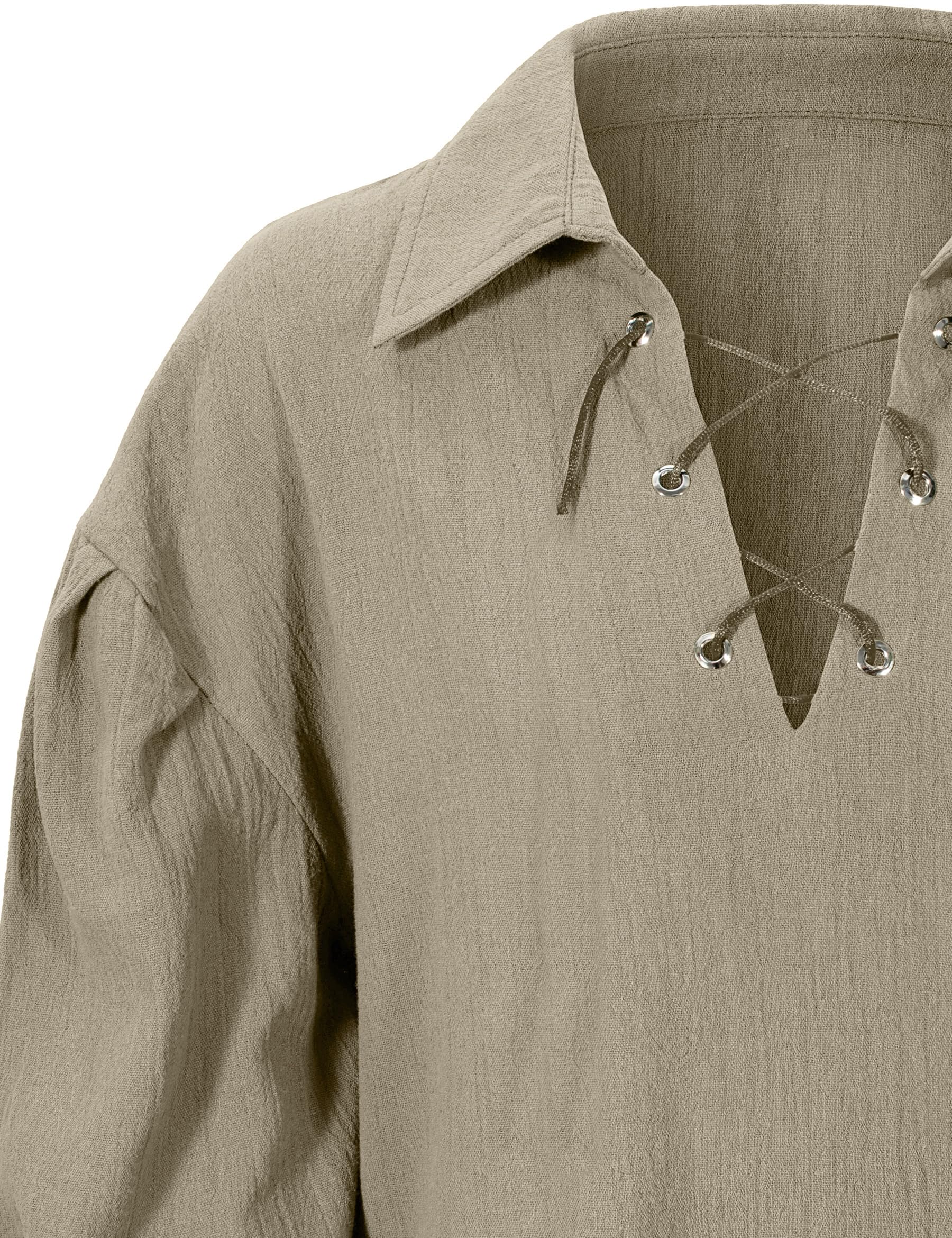 Features: Boy's Halloween costume shirt, vintage role-playing shirt, long sleeves, lace up neckline, loose fit, elastic wide cuffs, dropped shoulders, unique historical era style. | Material:This vintage shirt is made of high-quality cotton material, providing a soft, comfortable, and breathable wearing experience. | Size:3-4T; 4-6T; 6-8 Years; 8-10 Years; 10-12 Years;Please refer to the Size Chart for detailed dimensional data. | Design:When worn, it has a puffy appearance, and the sleeves feature a cuffed design, giving it a very vintage feel. | Occasions: Perfect for Viking shirt, Medieval themed parties, Renaissance role play, Pirate cosplay,pioneer dress up,Stage performance,Halloween, Christmas, Carnival,celebrations, festive Party,birthday party games, and so on.