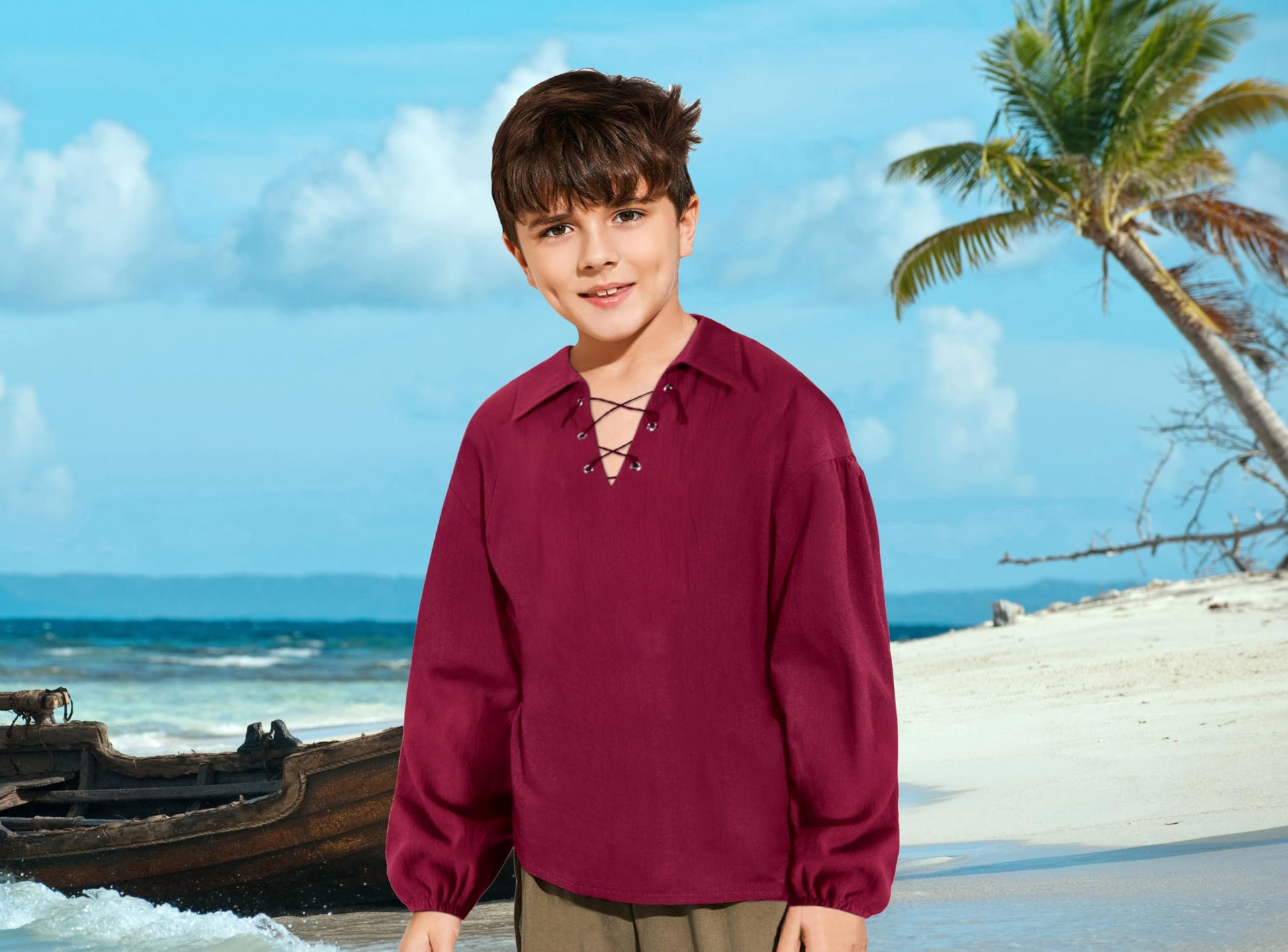 Features: Boy's Halloween costume shirt, vintage role-playing shirt, long sleeves, lace up neckline, loose fit, elastic wide cuffs, dropped shoulders, unique historical era style. | Material:This vintage shirt is made of high-quality cotton material, providing a soft, comfortable, and breathable wearing experience. | Size:3-4T; 4-6T; 6-8 Years; 8-10 Years; 10-12 Years;Please refer to the Size Chart for detailed dimensional data. | Design:When worn, it has a puffy appearance, and the sleeves feature a cuffed design, giving it a very vintage feel. | Occasions: Perfect for Viking shirt, Medieval themed parties, Renaissance role play, Pirate cosplay,pioneer dress up,Stage performance,Halloween, Christmas, Carnival,celebrations, festive Party,birthday party games, and so on.