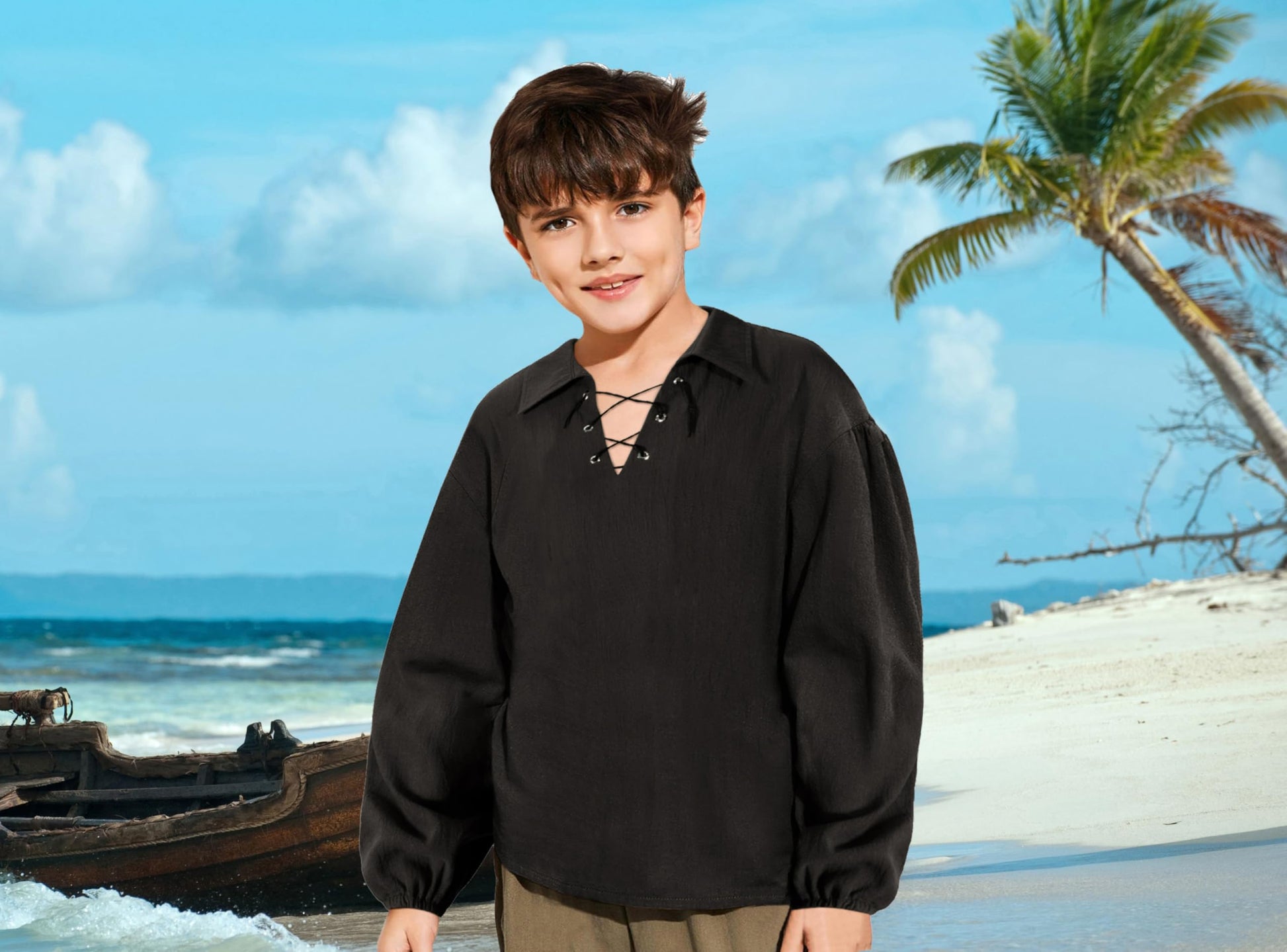 Features: Boy's Halloween costume shirt, vintage role-playing shirt, long sleeves, lace up neckline, loose fit, elastic wide cuffs, dropped shoulders, unique historical era style. | Material:This vintage shirt is made of high-quality cotton material, providing a soft, comfortable, and breathable wearing experience. | Size:3-4T; 4-6T; 6-8 Years; 8-10 Years; 10-12 Years;Please refer to the Size Chart for detailed dimensional data. | Design:When worn, it has a puffy appearance, and the sleeves feature a cuffed design, giving it a very vintage feel. | Occasions: Perfect for Viking shirt, Medieval themed parties, Renaissance role play, Pirate cosplay,pioneer dress up,Stage performance,Halloween, Christmas, Carnival,celebrations, festive Party,birthday party games, and so on.