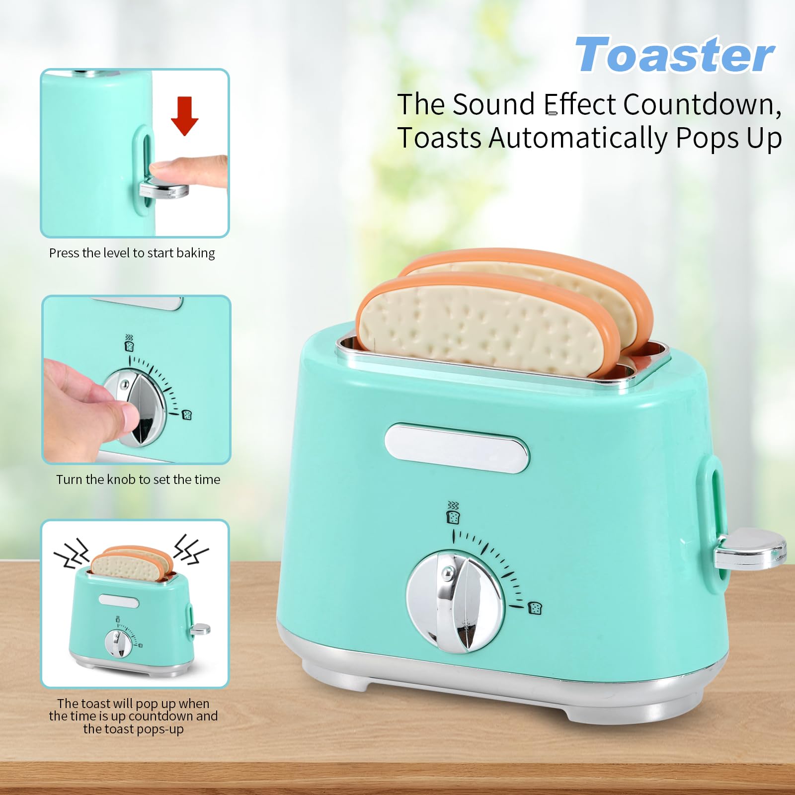 - Q: What items are included in the play kitchen accessories set? A: This play kitchen accessories set includes a coffee maker, mixer, toaster, blender, 2 spoons, 2 cups, 2 coffee cups, 2 plates, 2 coffee spoons, and 2 pieces of toast, offering a comprehensive pretend cooking experience.