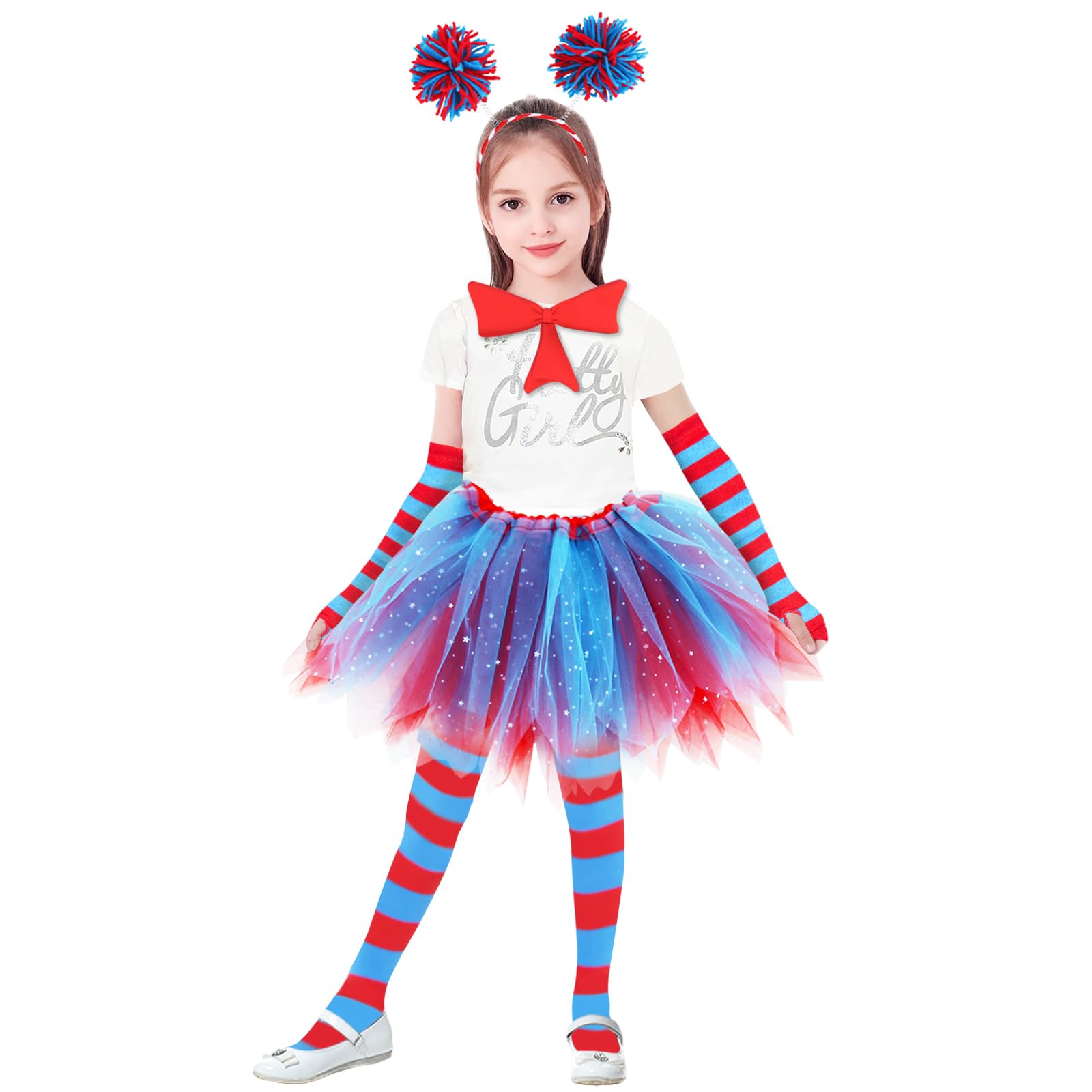 ?Lovely Tutu Skirt Outfit?This tulle tutu dress for girls set inclued: 1*Red and Blue Tutu Skirt, 1*Pompom Headband, 1*Red Bow Tie, 1*pair of Red and Blue Striped High Socks, 1*pair of Arm Warmer Gloves. Sweet and playful fluffy tutu skirt, paired with fun headbands and exquisite bow ties, make children instantly become the most dazzling presence in the crowd, satisfies the little girl's princess dream! | ?3 Layer Tulle Tutu Skirt?The tutu skirt is made of polyester fabric, the design of 3 layers of tulle fabric makes the skirt look more fluffy and lightweight. The irregular skirt hem and sparkling sequins make the skirt shine brightly under the light, like elves in fairy tales. The elastic waistband with satin lining can be stretched adjustment, suitable for the body shape of most little girls. | ?Pompom Headband and Bow Tie?Lively pompom headband paired with a vibrant red bow tie, make your kids look dynamic while performance! The headband is elastic, lightweight and sturdly, suitable for most people's head circumference. Unique red bow tie matching clothes, could add more charm for your dress up! | ?Striped High Socks and Gloves?Red and blue striped high socks and arm warmer gloves are made of high quality cotton material, comfortable and soft to wear, good elaastic and breathable, not easy to break or slip, perfectly conforms to the leg lines. The socks length is about 24 in, glove is 11.8 in, suitable for children. | ?Ideal Gifts for Kids?These beautiful tulle tutu dress is suitable for Reading Day, school party cosplay, ballet dress, stage performance, birthday party, thing 1 and thing 2 costumes, Carnival, Christmas Party, Halloween Cosplay Costume is the best gift for kids! Your kids will fall in love with this playful outfit, create a exciting and happy atmosphere for party performance!