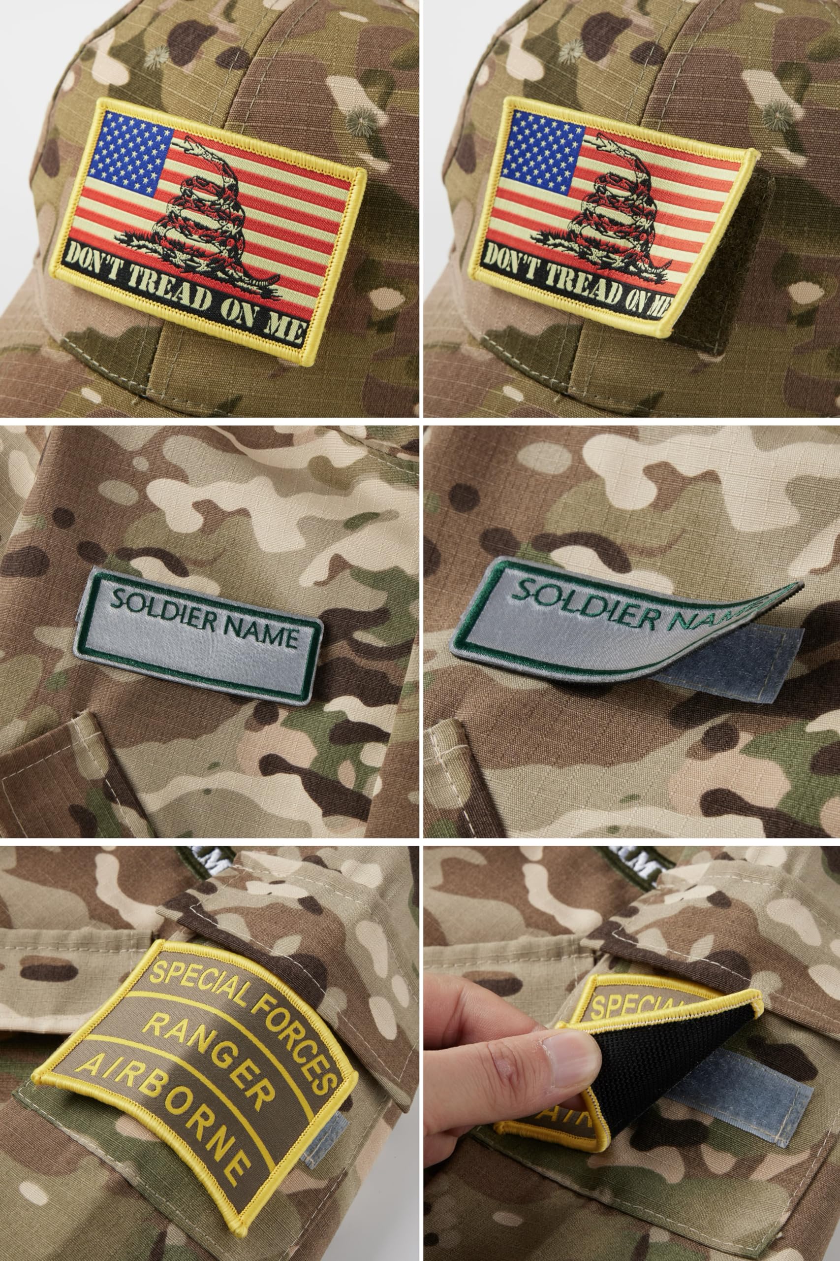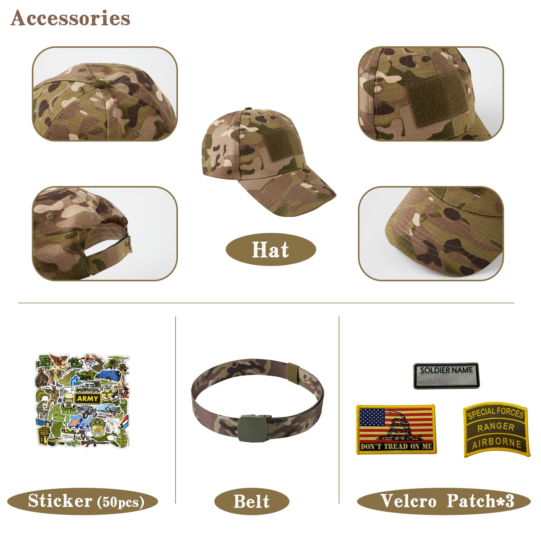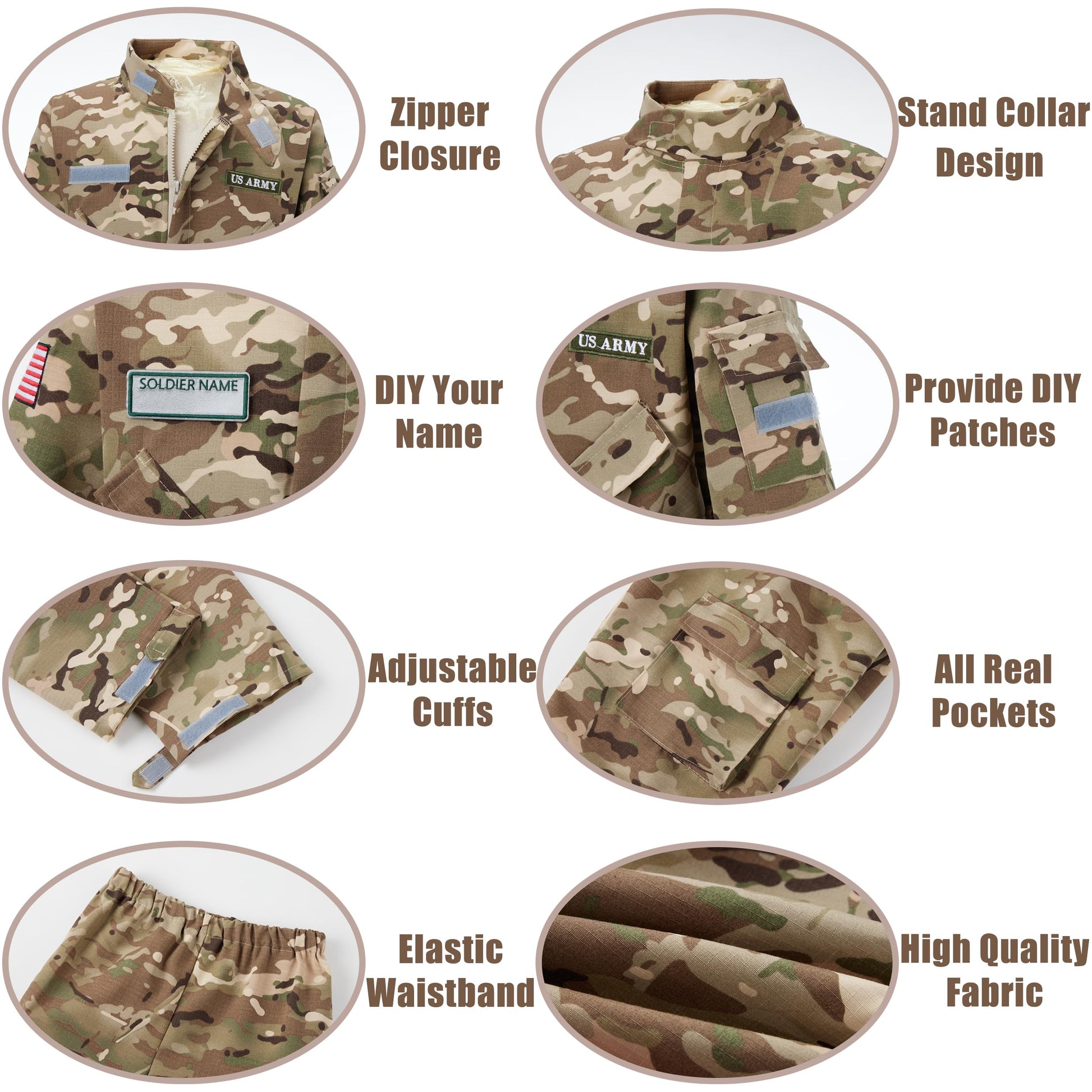 Army Costume Suitable for boys and girls: Great for army party,Halloween,family events,school events,outdoor adventure, trick-or-treating,birthday party,army/soldier pretend cosplay or one-on-on role play all year round.Good choice for birthday gift,Children's Day gift,party return gift and more Accessories: 1.Army Belt 2.Army Hat 3.Army Stickers Make your kid more like the American Soldier Material:High quality polyester with abrasion resistant Color:Camo Size: 1.Size S:Top Length:19.7inch(from shoulder to hem),Shoulder Width:11.4inch,Chest:30.7inch,Sleeve Length:15inch,Pant Length:25inch,4-6Years; 2.Size M:Top Length:21.3inch(from shoulder to hem),Shoulder Width:12inch,Chest:32.3inch,Sleeve Length:16.5inch,Pant Length:28inch,6-8Years; 3.Size L:Top Length:22.9inch(from shoulder to hem),Shoulder Width:13inch,Chest:33.9inch,Sleeve Length:18inch,Pant Length:30.7inch,8-10Years; 4.Size XL:Top Length:25inch(from shoulder to hem),Shoulder Width:14.6inch,Chest:37inch,Sleeve Length:20.5inch,Pant Length:34inch,11-13Years; Notice: 1. Size in 0.5 to 1inch size difference is in normal range due to manual measurement and elasticity 2. Color may have a little difference due to lights, screens, etc. Package:Army Jacket X 1,Army Pants X 1,Army Belt X 1,Army Hat X 1,Army Stickers X 1