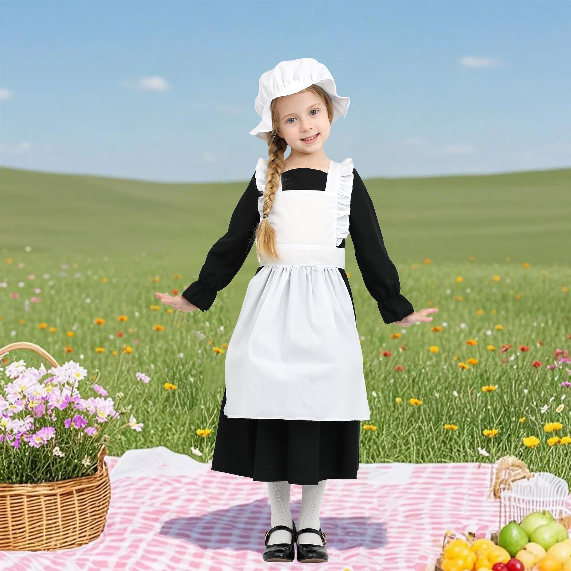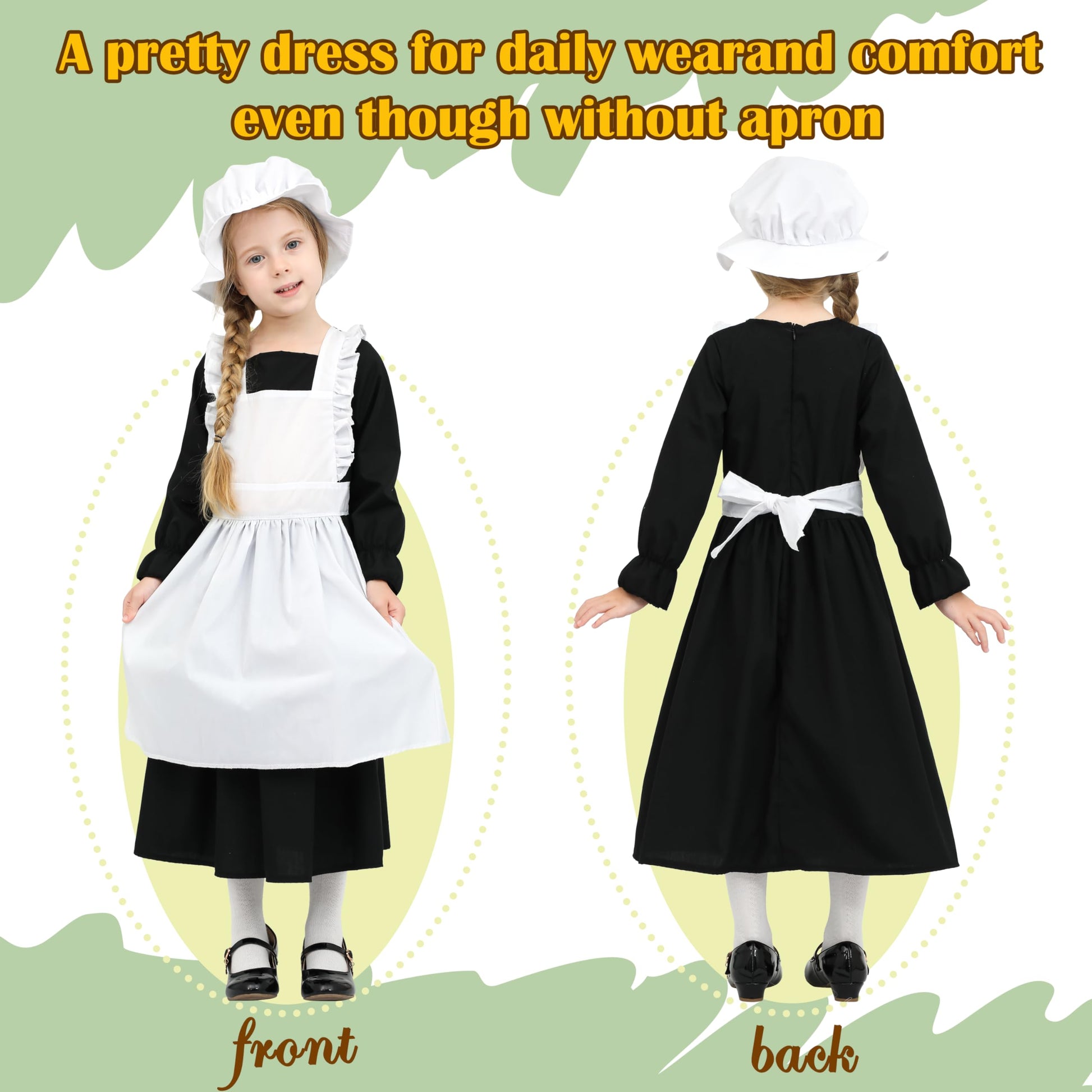 Lingway Toys Girls Pioneer Costume,Black Colonial Prairie Dress for Girls with Apron and Bonnet 6-8