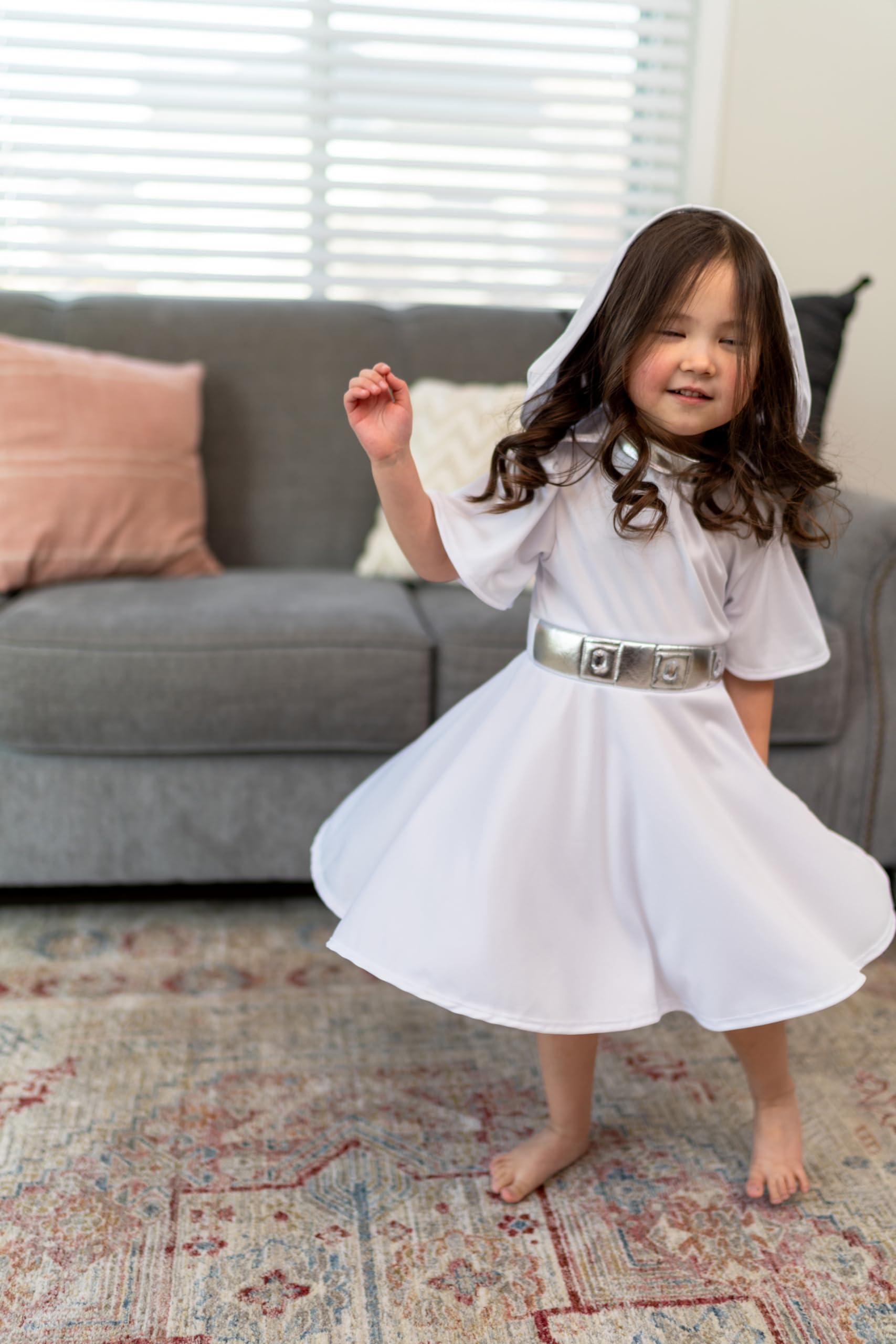 Your little space adventurer will be ready to take on any mission in their new Galactic Princess Twirl dress! Let the fun begin! Designed for twirling - cut from a full circle of fabric which allows it to billow out as your little one spins and dances. Soft stretch bodice with attached galactic hood. Flowy sleeves and a matching sewn in silver belt. (Accessories sold separately). There are no itchy underskirts and fabrics, and it comes with completely finished seams and hems. There are no buttons or zippers to frustrate little fingers, and best of all, its machine washable! Do you have a little princess that loves tea parties, dancing, baby dolls and wearing princess dresses, but can't stand the itchy, uncomfortable fabrics or seams? Or is your princess the industrial type - preferring water fights to tea parties, running over walking, and living in their dress ups, but can outplay any princess dresses available? Then Little Adventures is your answer. Designed by two moms, Jenny and Heather, with little prince & princesses of their own - Little Adventures products are DRESS UPS MADE FOR EVERYDAY PLAY! Heather and Jenny were frustrated with the fact that dress ups couldnt be washed. The fabrics would fall apart in the washing machine and many were made to be dry-cleaned only, an absolutely absurd idea for a practical mom. They knew there had to be a better way! So Little Adventures began! (Crown, flower headbands, and other accessories sold separately). COMFORTABLE - WASHABLE - EVERYDAY PLAY - BECAUSE CHILDHOOD IS AN ADVENTURE!!!