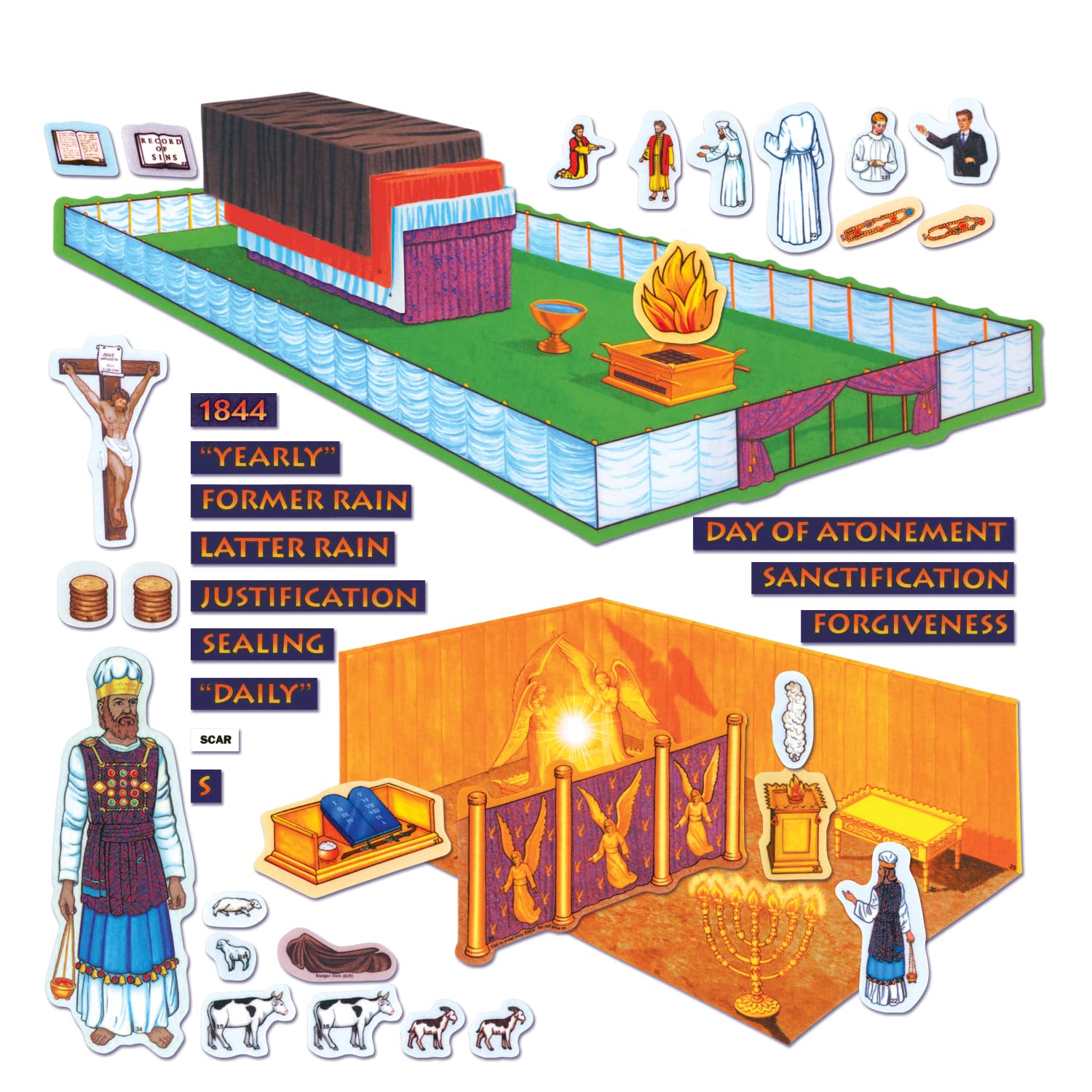 Accurately portrays the rooms and furniture of the tabernacle in full color. Included are 12 devotional talks for young children. *Purple felt board/background is not included but sold separately.*