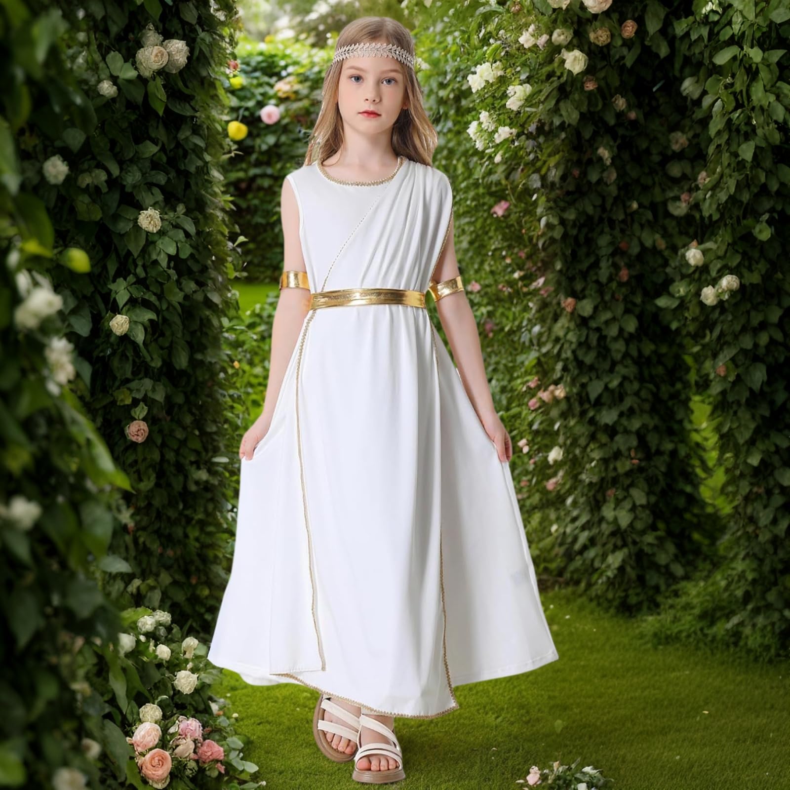 Greek goddess costume for girls features gold leaf headband, gold wrists, elastic gold belt, white long sleeveless dress. There are 4 sizes available--M/L/XL/XXL. Suitable for history theme parties, greece theme parties, rome nobility role play, God role play and other occasions.