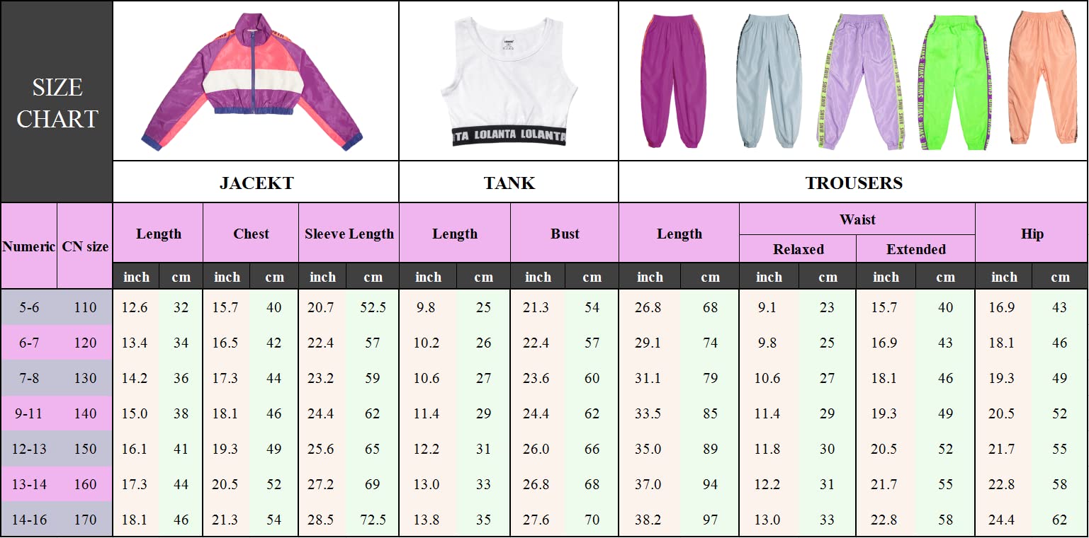 It's a dynamic three-piece set which jacket*1, tank top*1, trousers*1. The personalized color blocking design will outstand your children look, create a stylish sense, suitable for daily outfits, dance performances, hip hop dance classes or competitions, carnival and other activities. Get Lolanta dance set for your kid as a gift! Es un din mico conjunto de tres piezas: chaqueta*1, camiseta de tirantes*1, pantalones*1. El diseo personalizado con bloques de color destacar el aspecto de tus hijos, crear una sensaci n de estilo, adecuada para la ropa de diario, actuaciones de baile, clases o competiciones de baile hip hop, carnaval y otras actividades. Regala a tus hijos el conjunto de baile Lolanta.