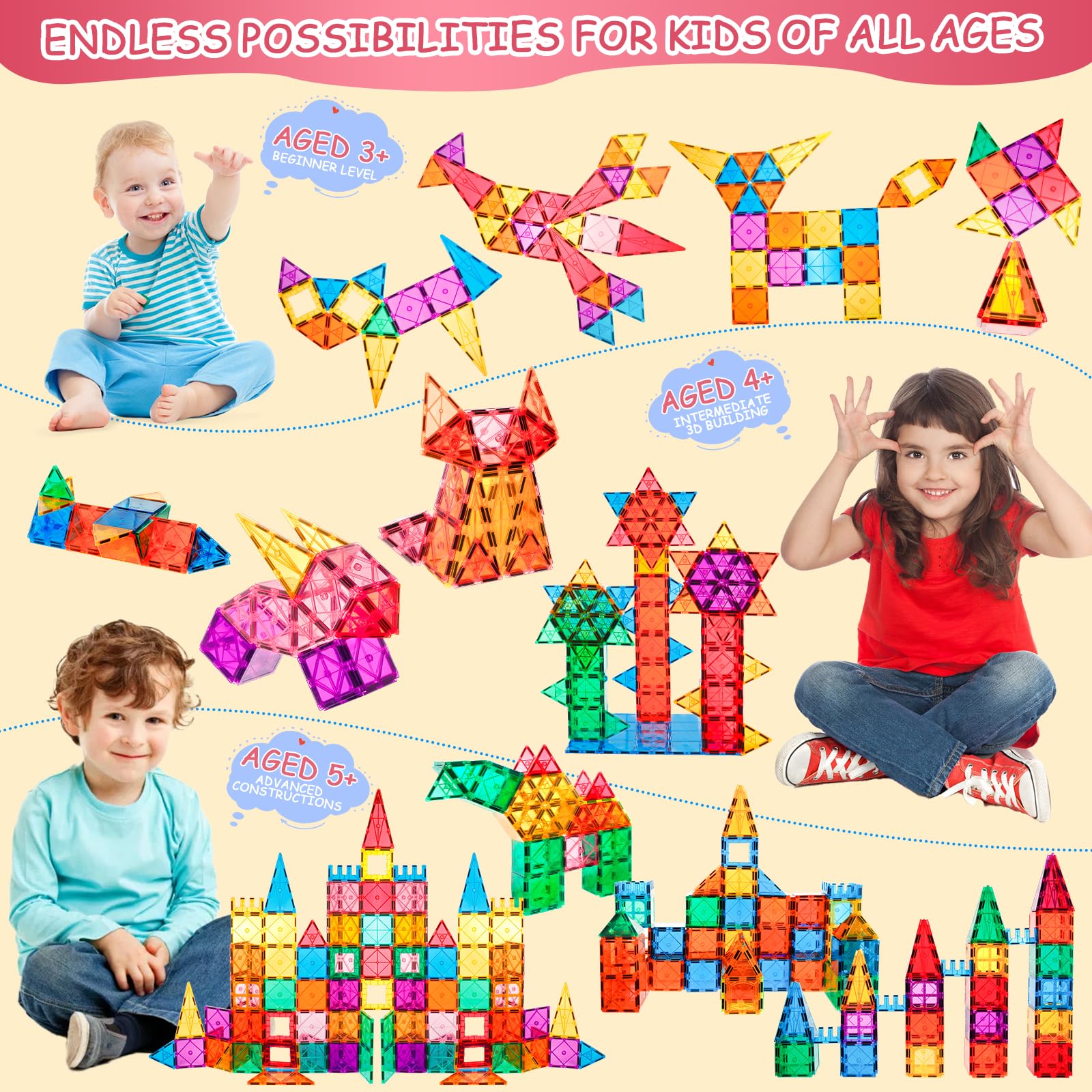 • Q: What age is the Lotmey Magnetic Tiles set suitable for? A: The Lotmey Magnetic Tiles set is suitable for toddlers and kids aged 3 and up, making it an excellent educational toy for preschoolers.