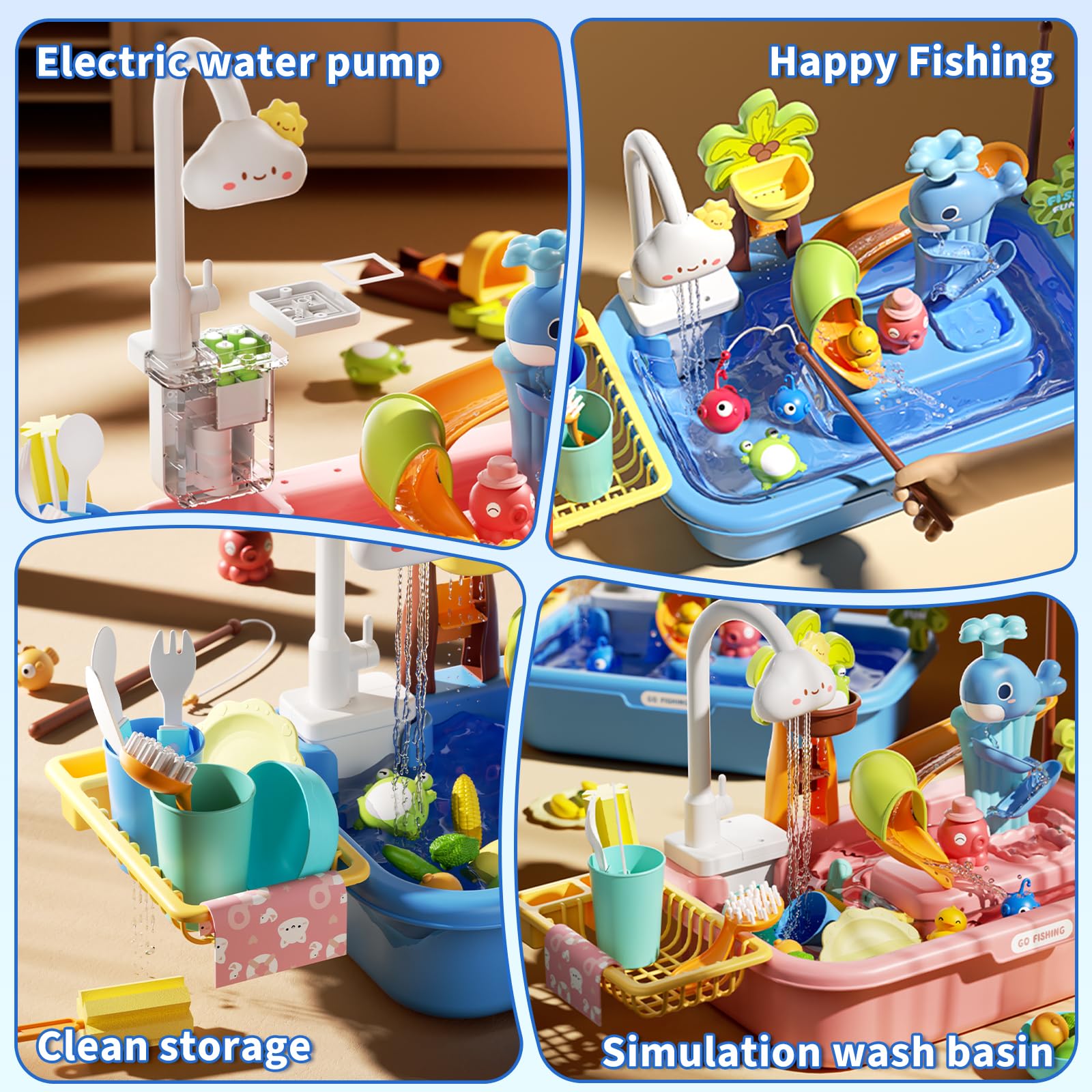 This play sink with running wate combines 3 functions of kitchen toys, fishing games, water table. It equipped with electric faucet, food toys, fishing rods, kitchen accessories and other play tools. Kids will love this pretend toy set and enjoy the double fun of playing in the kitchen and fishing.Large capacity sink toy encourages baby to wash hands frequently to stay healthy and save water, and learn life skills. It is suitable for playing in indoor or outdoor and other scenes. Comes with a beautiful gift box, this is the perfect birthday, Christmas, Easter, Thanksgiving gift toy for 3 4 5 6 year old boys and girls.